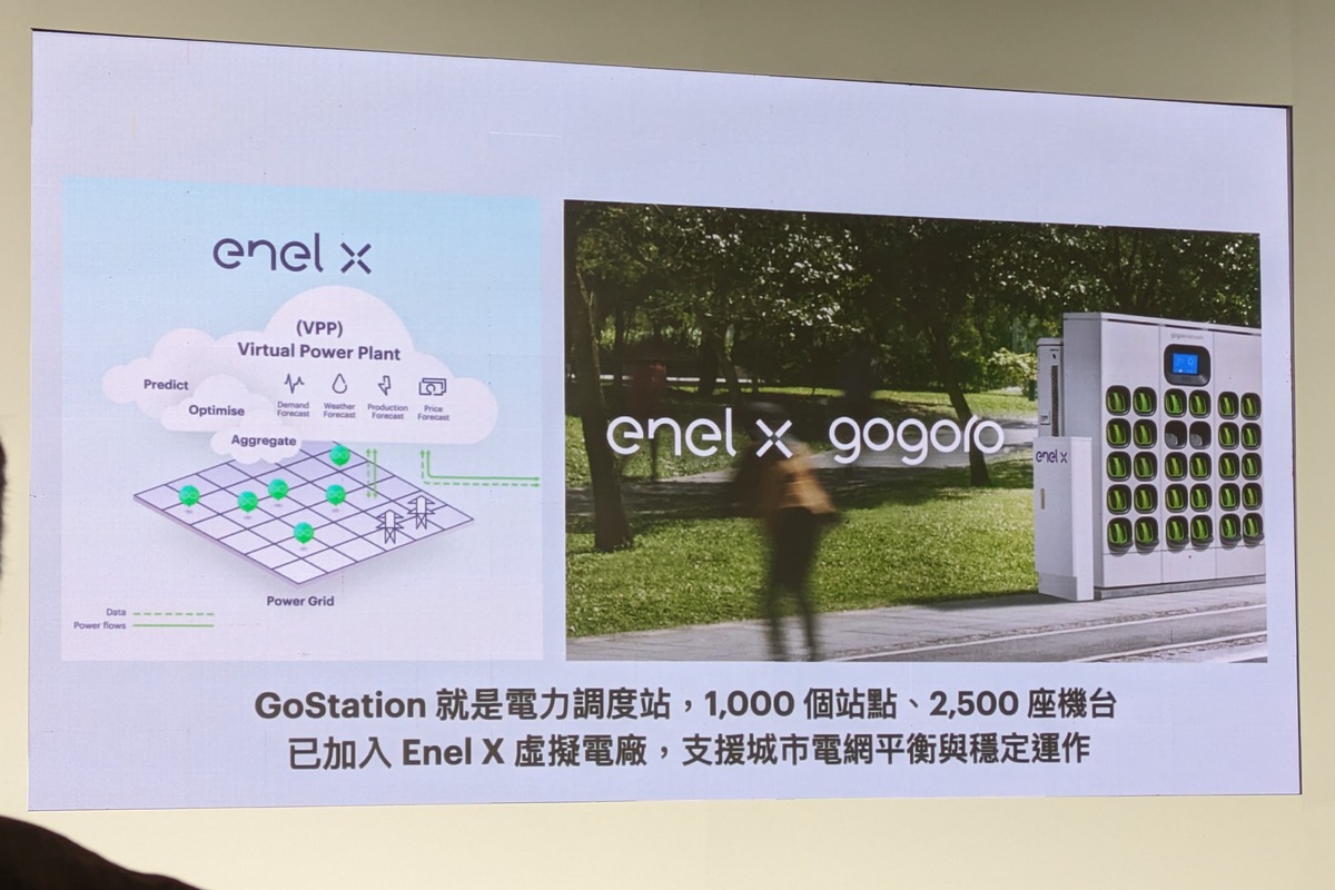 攜手創新能源服務及虛擬電廠龍頭 Enel X(義電智慧能源),完成部署全台逾 1,000 個電池交換站點、2,500 座機台加入 Enel X 虛擬電廠(Virtual Power Plant, VPP),參與台電電力交易平台的電力輔助服務市場。當電網失衡時,GoStation 能夠安全降載、或在必要時饋電至電網,使其維持穩定運作。這是全球第一個整合虛擬電廠與電池交換能源網路的商轉成功案例。