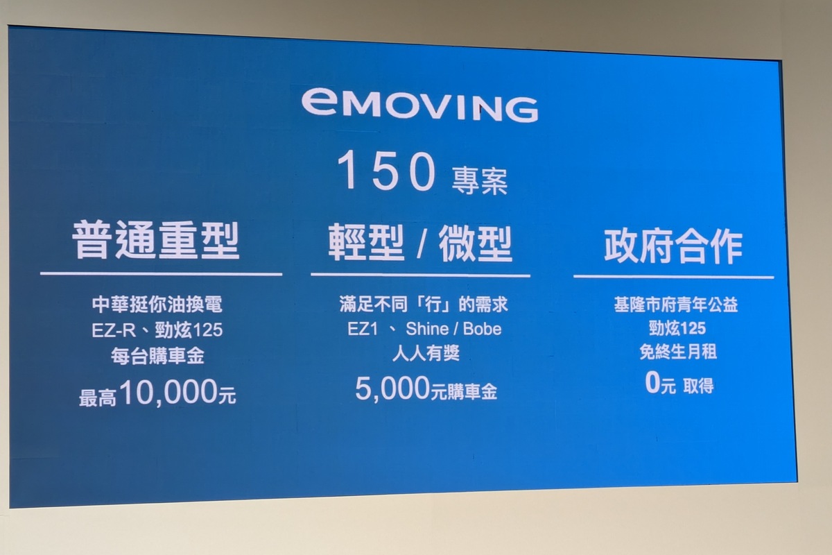 eMoving 率先響應淨零轉型,釋出限時「150 專案」優惠 —— 針對旗下白牌、綠牌、微型二輪給予最高 1 萬元購車金,並陸續與各地政府合作推出專屬購車方案,加速電動機車普及。