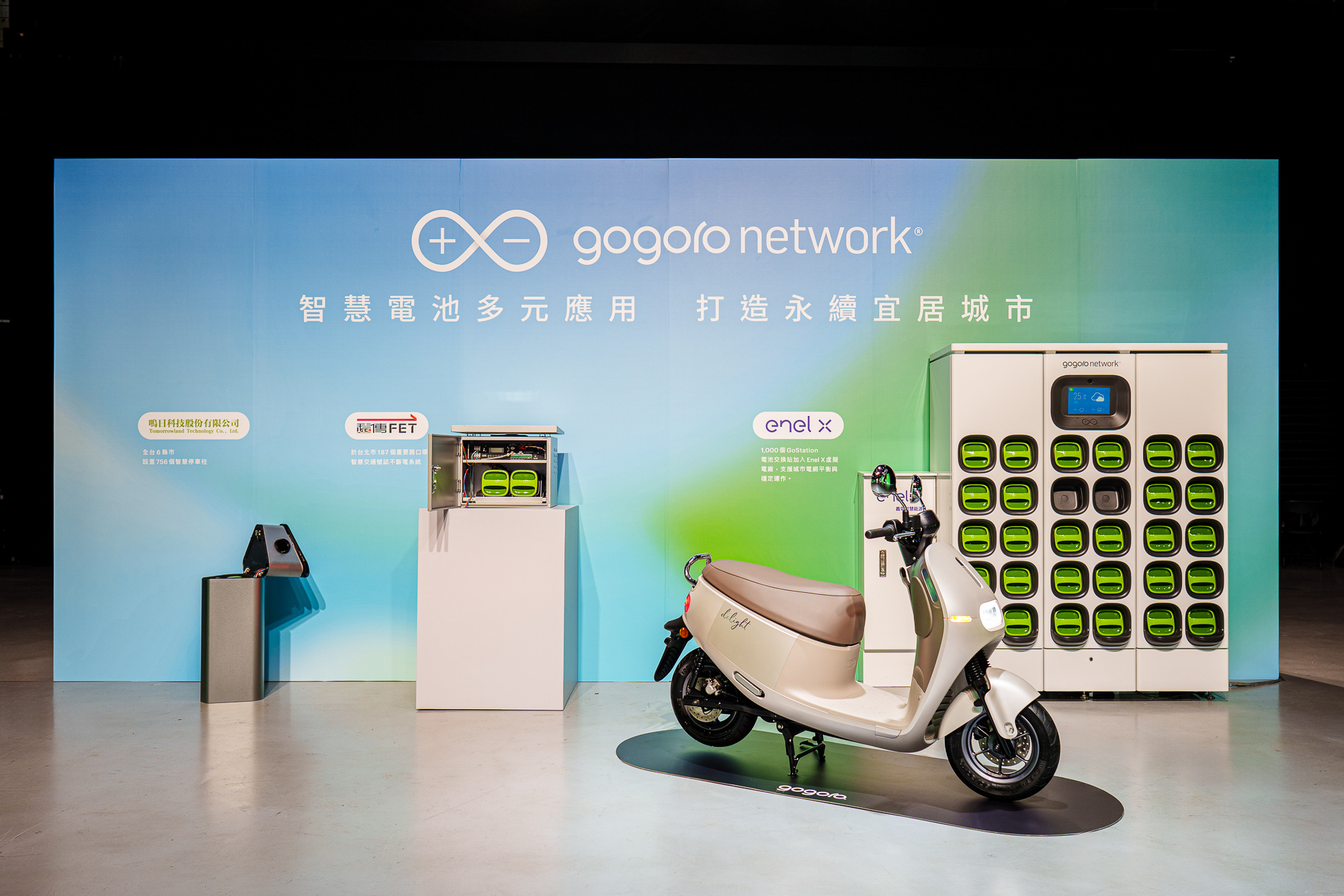- 攜手創新能源服務及虛擬電廠龍頭 Enel X(義電智慧能源),完成部署全台逾 1,000 個電池交換站點、2,500 座機台加入 Enel X 虛擬電廠(Virtual Power Plant, VPP),參與台電電力交易平台的電力輔助服務市場。當電網失衡時,GoStation 能夠安全降載、或在必要時饋電至電網,使其維持穩定運作。這是全球第一個整合虛擬電廠與電池交換能源網路的商轉成功案例。