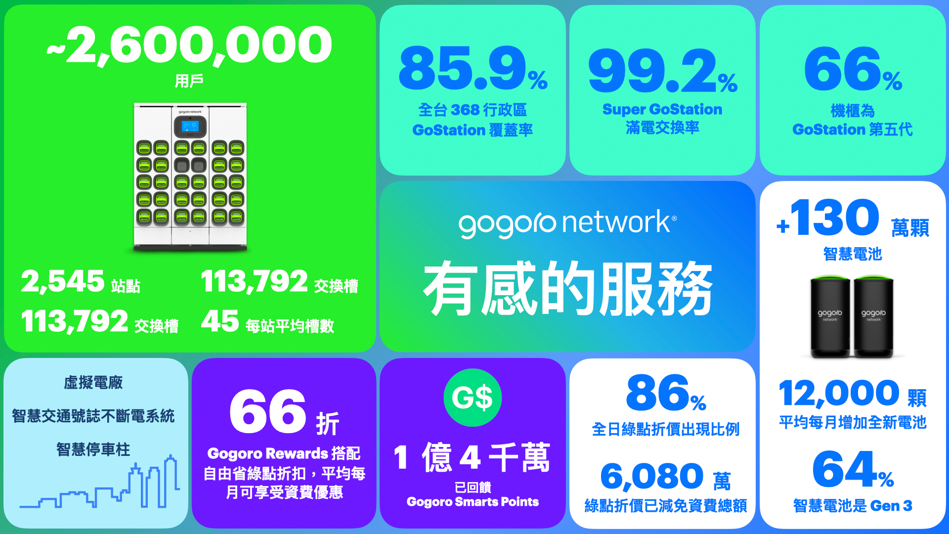 伴隨著各家夥伴齊力促進電動機車普及和用戶數迅速增長,Gogoro Network 至今已在全台建置2,545 個 GoStation 電池交換站、12,325 個機櫃 3 、113,792 個電池交換槽,相當於平均每站就擁有 45 個槽數。Gogoro 台灣總經理姜家煒表示:「經過八年的深耕,電動機車的能源基礎建設已經到位,換電已成為日常生活中的一部分。Gogoro Network 朝著『打造有感服務』的目標邁進,不僅電網穩定成長,還透過 Gogoro Rewards 點數獎勵計畫等服務,大幅降低電動機車入手門檻與總體擁有成本。我們將致力發展更優質、更多元的體驗,讓更多消費者輕鬆加入電動機車行列,共同擴大永續影響力。