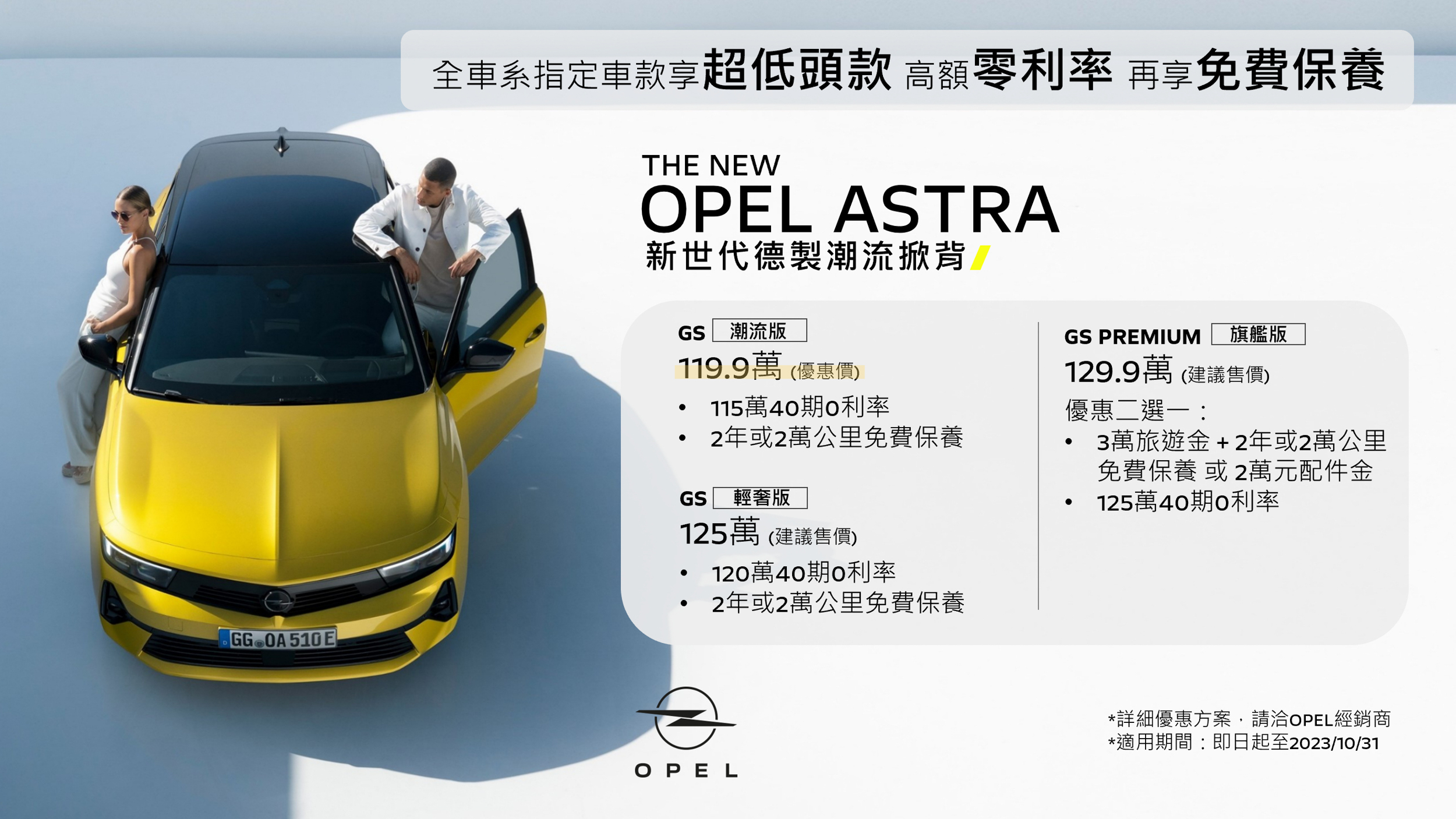 - ASTRA本月優惠價GS潮流版119.9萬元、GS輕奢版125萬元、GS PREMIUM旗艦版129.9萬元,享超低頭款40期高額0利率,指定車型加贈3萬旅遊金與2年2萬公里保養或2萬元配件金。