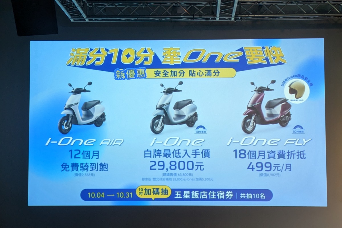 【最佳比例】i-One Air:購車就送12個月免費騎到飽 (價值9,588元) 及Ionex 精品安全帽 (價值 2,200元)