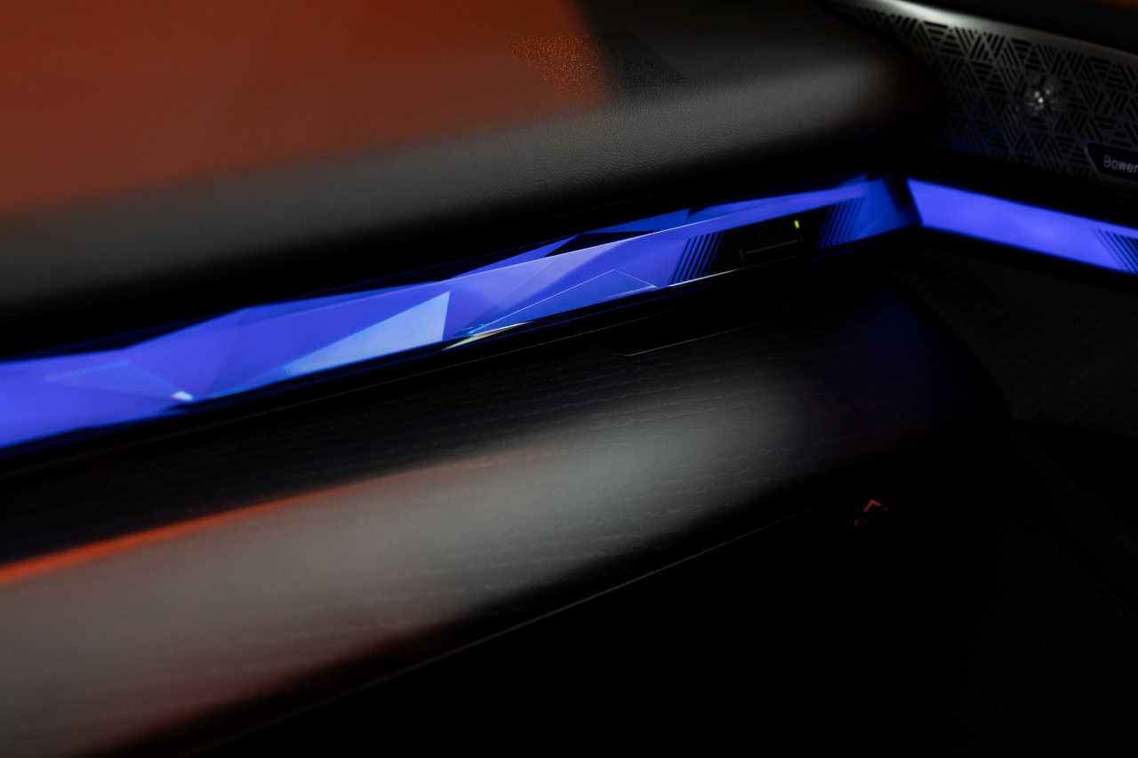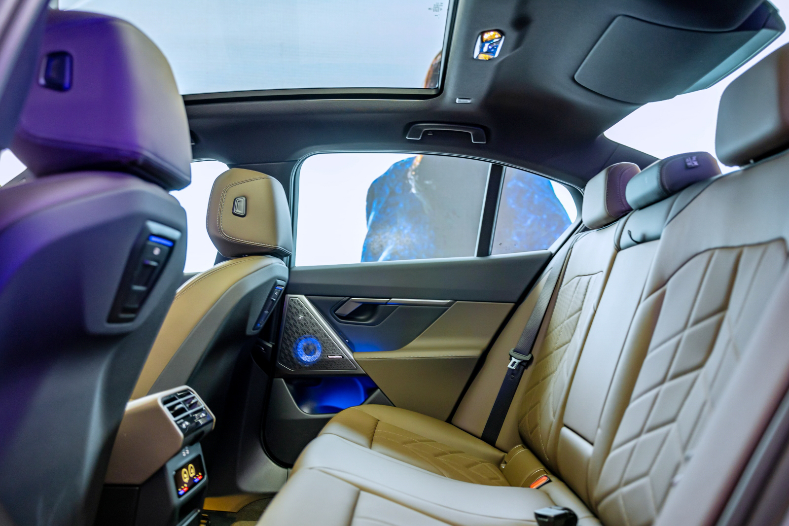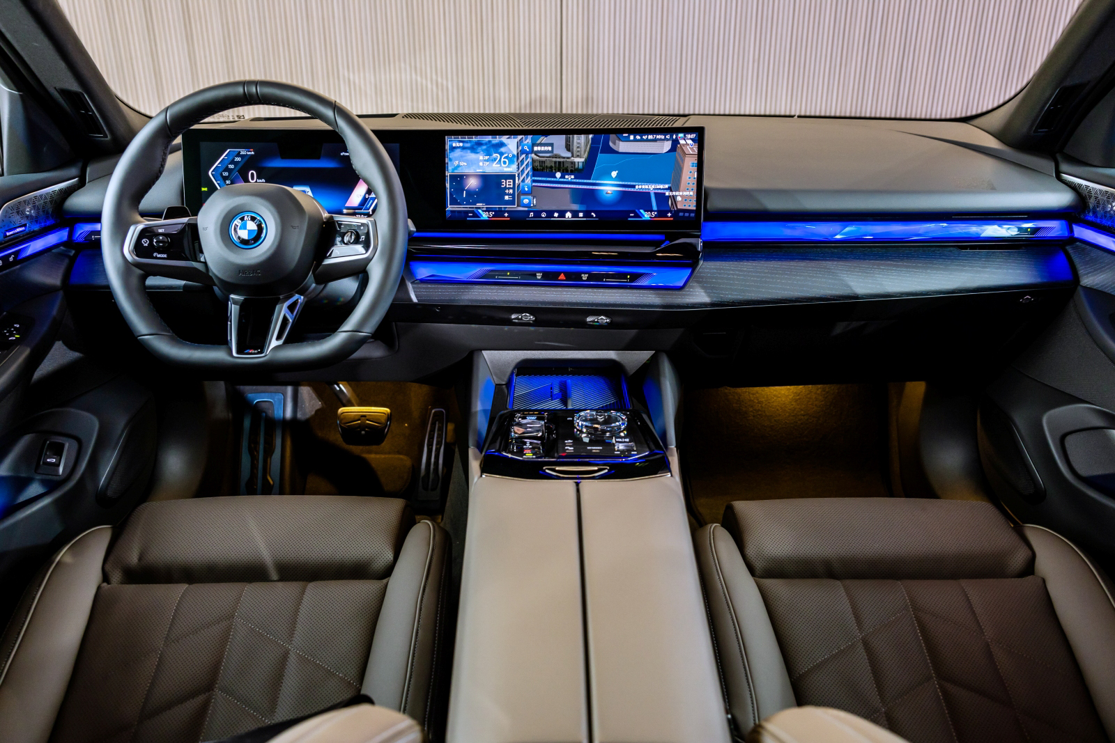 全新BMW i5為眾人展演了超越當代的精湛表現,座艙豪華質感更向旗艦邁進,超越5米達到5,060mm的車長結合2,995m將近3米的軸距,不僅為座艙帶來寬敞舒適的乘坐空間,5系列首次導入的全景式玻璃車頂更為車室乘員圍繞出愜意氛圍,同時在擁有多達17具揚聲器的Bowers & Wilkins頂級音響系統匯聚之下,讓全新BMW i5以優越之姿望向層峰,而全新i5 M60 xDrive立足於豪華更登性能風采,駕駛座艙最搶眼的莫過於M Nappa真皮平底方向盤含紅色指向標示,大幅強化熱血氣息,展現專屬於電能的性能風采。