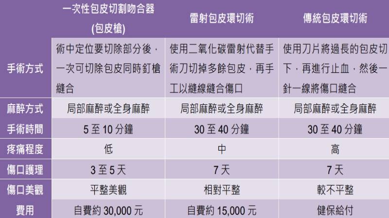 一般割包皮採局部麻醉,若是小於9歲或怕痛的病人,亦可採靜脈麻醉,就不會感到不適。蘇家震主治醫師說明,手術方式有「傳統包皮環切術」和最新的「一次性包皮切割吻合器(又稱包皮槍)」方式。相較於傳統包皮環切術,一次性包皮環切吻合器手術時間僅需5至10分鐘,術中出血及術後疼痛也比較少、康復時間短,對於不希望長時間休息的病人更是一大優勢。不過,有些狀況像包皮嚴重沾黏的病人,就不適合使用包皮槍。而無論接受傳統手術或是包皮槍,術後包皮都有可能出現浮腫,故建議使用紗布及彈性繃帶覆蓋陰莖,並保持傷口乾燥及局部清潔,若小便汙染敷料則需盡速更換,避免反覆發炎的情況發生。
