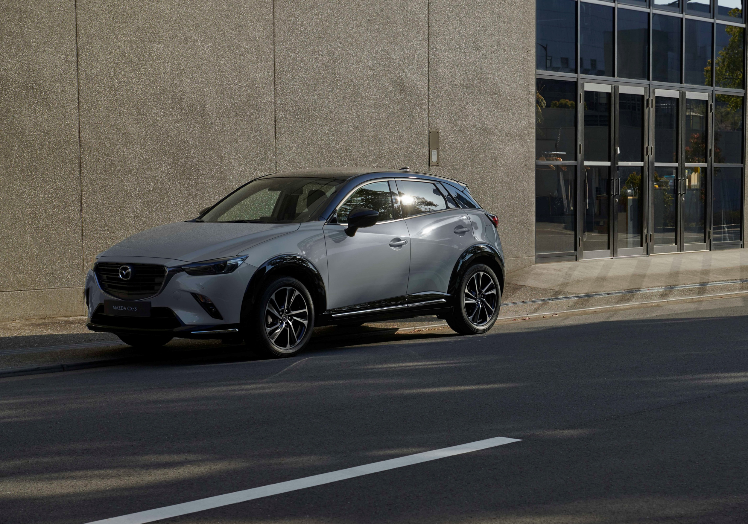 MAZDA CX-3 外觀設計忠於 KODO 的核心精神,除了體現富含生命力的動態之美,承襲日式極簡美學、摒棄多餘綴飾,只為了讓車身比例臻於完美。透過職人雙手,精雕出深具力道的簡約線條,形塑 MAZDA CXḋ3 的強勁姿態。24 年式 MAZDA CX-3 導入全新 20S Vivid Edition 車型,在車輛內外觀皆採用最能彰顯車主自我風格與個人品味的雙色搭配,不僅車頭經典魂動之翼採用爍黑設計,結合 Vivid Edition 專屬曜黑懸浮式車頂、曜黑後視鏡、曜黑環車護板及雙色 18 吋鋁圈,展現超群出眾的獨特魅力及讓人難以忽視的個性主張;內裝配置 Vivid Edition 專屬藍黑雙色內飾搭配麂皮質感運動化座椅,輔以 Vivid Edition 別出新彩的專屬新車色天際灰 (Aero Grey) ,魅力風範由內至外自然流露,也體現 MAZDA CX-3 車主不隨波逐流的自信風采。