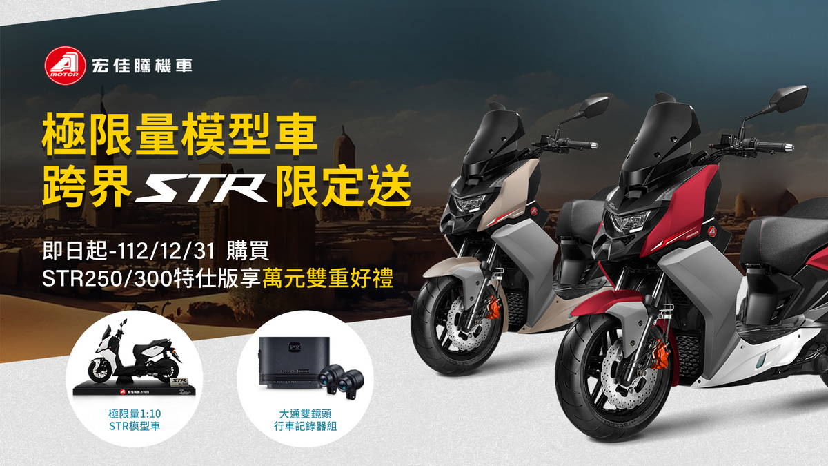 此外,宏佳騰歡慶25週年,以特仕塗裝色為熱銷車款打造經典,其中,跨界大羊STR 300推出特仕版新色「荒漠沙」、「耀日紅」,以純粹魅力時尚登場,建議售價$149,800元,限量350台,即日起至12月31日,入主絕對力量STR 250或跨界大羊STR 300特仕版即享總價值破萬元的雙重好禮,包含「極限量1:10 STR模型車」及「大通雙鏡頭行車記錄器組」,另有信貸分期專案供選擇,貼心放大您的自由度。