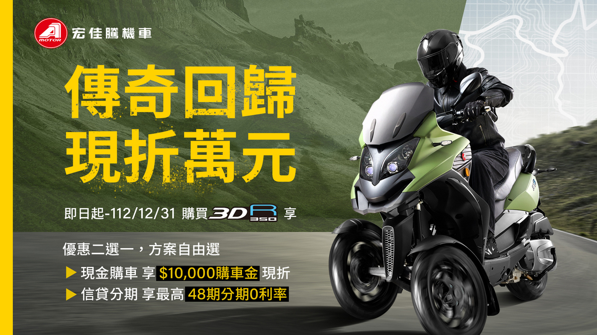 3D-350R推出全新三色,不論是熱愛自然簡約的「荒漠沙」、「墨軍綠」,還是偏好都市時尚的「消光黑」,消費者都有多種風格可選擇,建議售價$238,800元,即日起至12月31日,以現金購買3D-350R可現折$10,000元,另有信貸12/24/36/48期分期0利率方案,符合台灣七期及歐洲五期法規排放標準的3D-350R,讓你節能環保,省錢更省油。