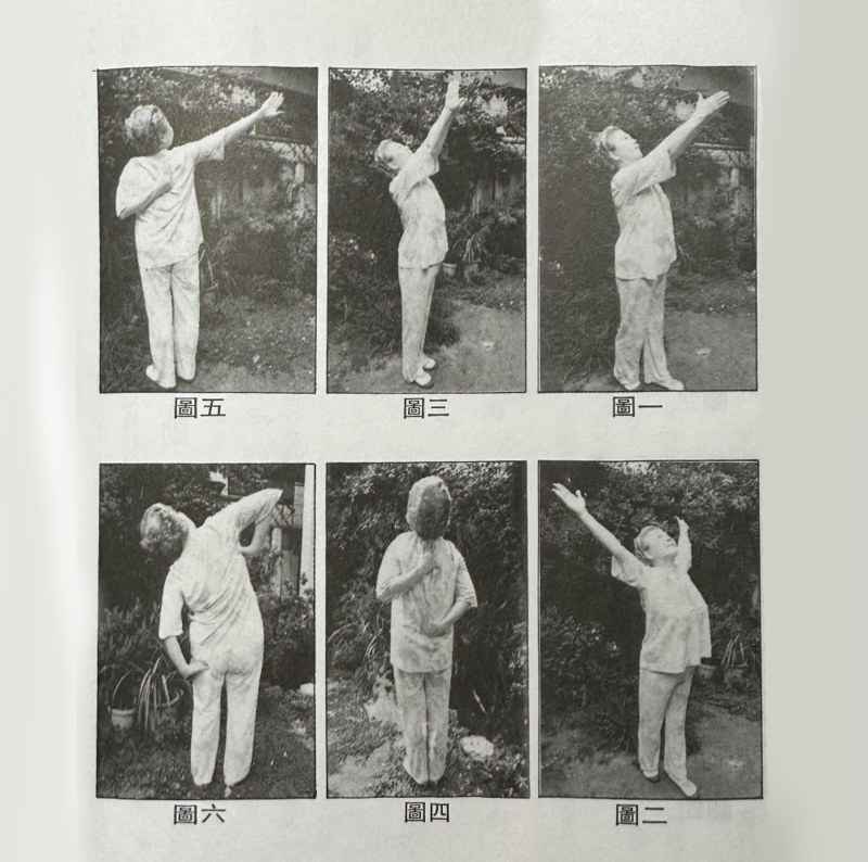 - 手放下,重複2的動作,手背相對,平舉過肩後,手心向後