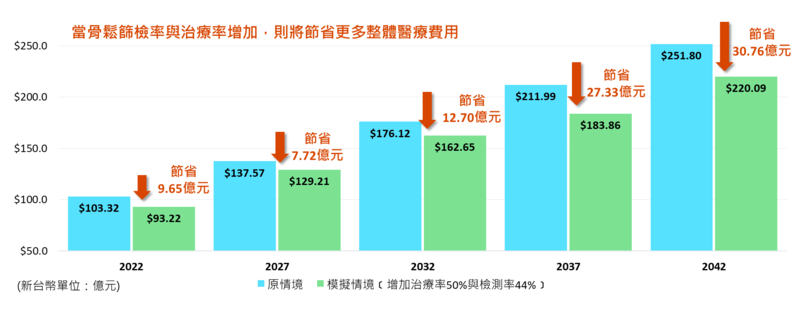 醫界近年來也持續呼籲政府提升骨鬆治療照護,提倡應積極落實高齡者定期骨密度檢測與接續治療。國立臺灣大學臨床藥學研究所所長蕭斐元教授針對未來20年間70歲以上停經後婦女發生骨折的事件數和直接照護費用進行藥物經濟模型之研究,研究結果指出,未來五年間,70歲以上停經後婦女人口預計將從2022年的144萬人增加至2027年的191萬人,且骨鬆骨折的案例將自2022年的7萬例增加至2027年的9萬例,整體預算成本花費也將從2022年新台幣103億增加到2027年新台幣137億,突顯骨鬆骨折案件數的大量增加,也呈現骨鬆性骨折將導致個人乃至於國家支出的大量醫療負擔。蕭斐元教授亦指出,透過骨鬆診斷常使用的雙能量X光吸收儀(DXA檢測)並搭配積極治療,將減少骨鬆骨折發生與直接醫療成本花費。根據本次研究模組顯示,當骨鬆篩檢率增加50%與治療率增加44%,則於2027年將減省整體醫療費用達新台幣7.7億,隨時間拉長節省的費用將更顯著;對於病患臨床結果、照護者的經濟與勞力成本,乃至於整個醫療體系都是正向的發展。