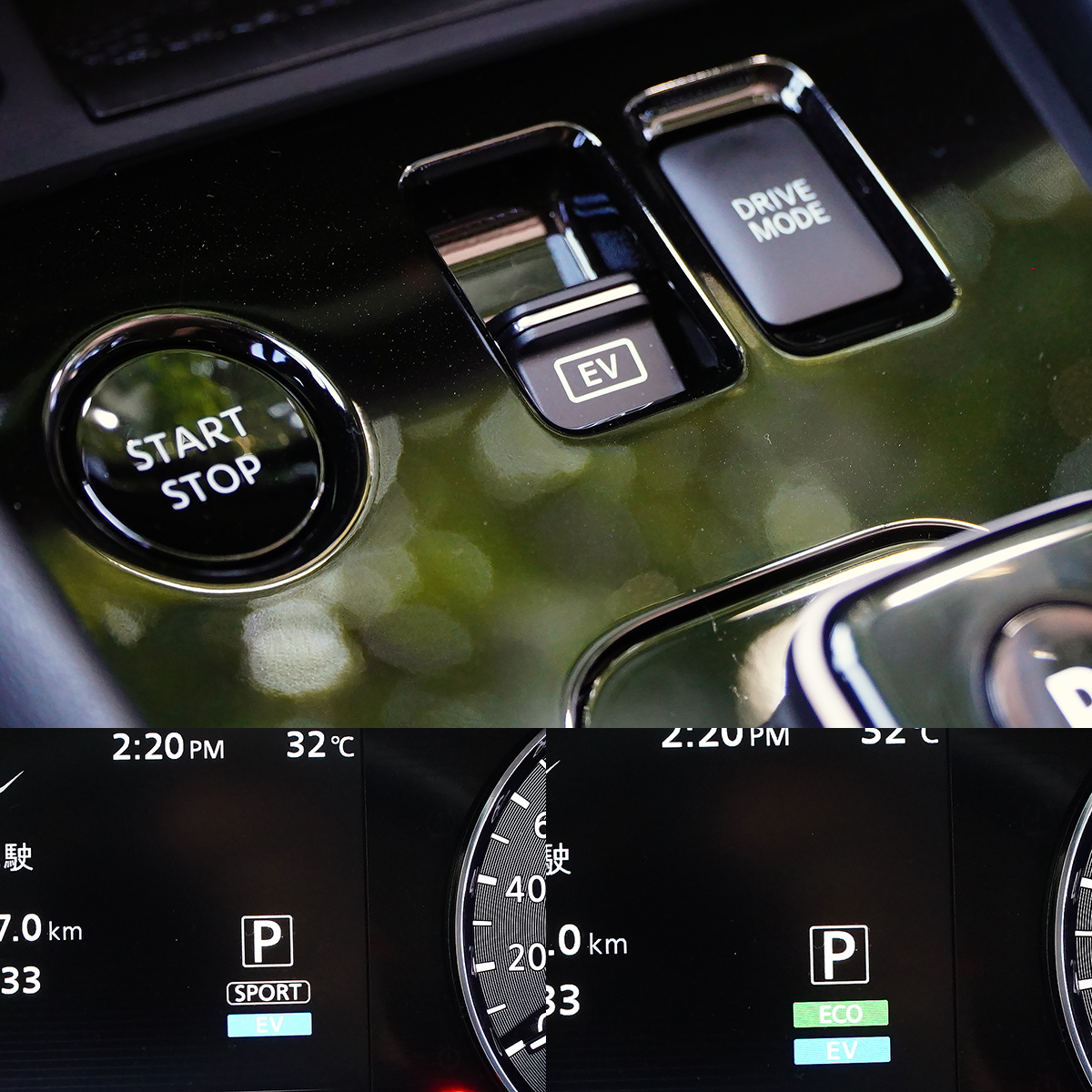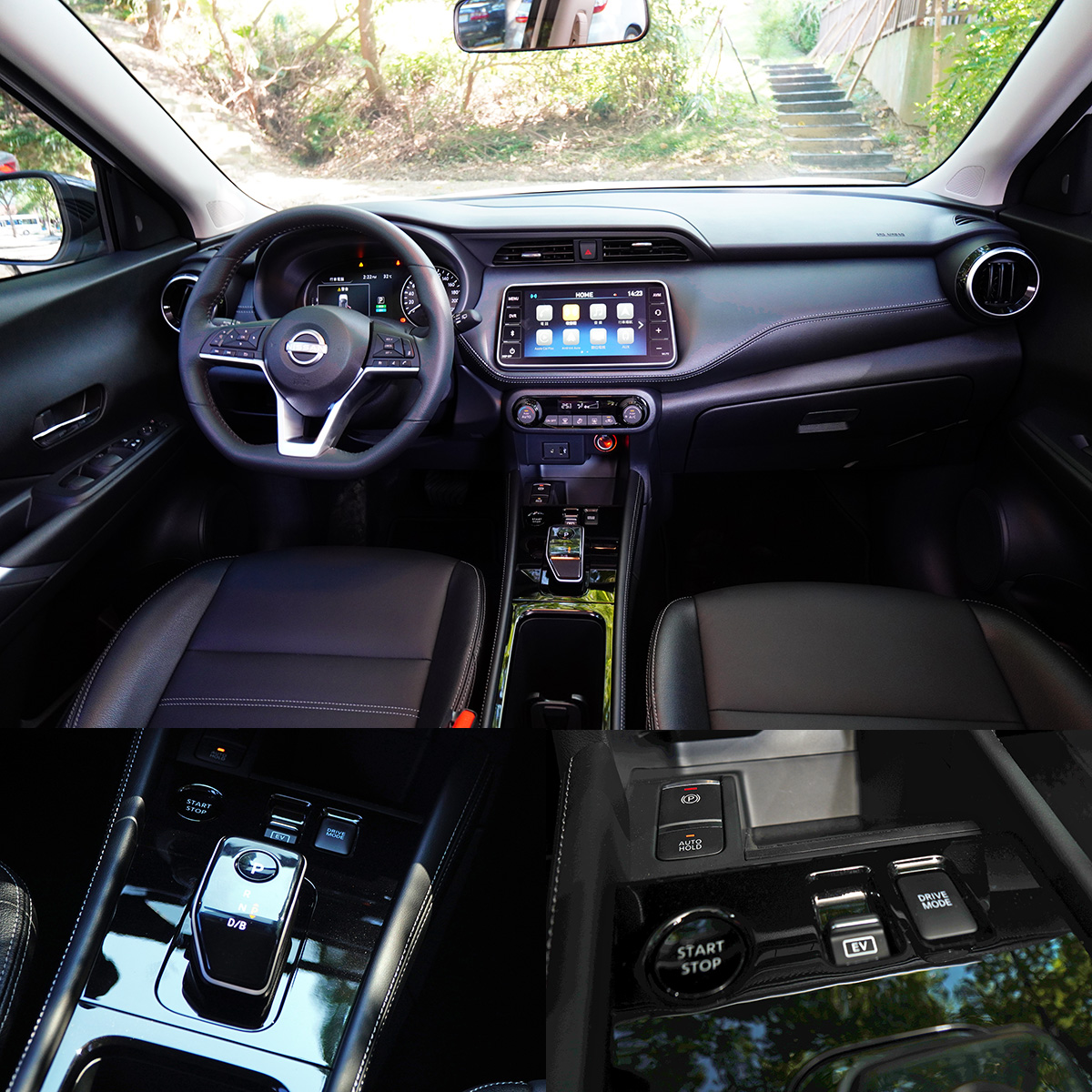 座艙中基本陳設大致相同,不過,Kicks e-Power配有質感更好的全車真皮3D超體感紓壓座椅及真皮D-Shape皮質運動直覺方向盤,而座椅舒適性向來是Nissan的強項,,Kicks e-Power必然維持了這項傳統,而在前座中央鞍座前緣多了動態模式與EV模式切換紐,並換上了鋼琴烤漆電子排檔桿,略增科技感。