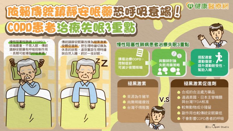 一位8旬慢性阻塞性肺病(COPD)爺爺咳喘嚴重,加上喪妻後悲傷失眠,服用安眠藥竟出現譫妄與躁動副作用!後來將傳統鎮靜安眠藥改換為褪黑激素受體促進劑,老爺爺就不再出現譫妄,終於能夠一夜好眠。莊立邦主任提醒,傳統安眠藥有抑制呼吸作用,COPD患者長期使用恐導致呼吸抑制,呼籲患者積極控制肺病症狀、適當運動復健,並且與醫師討論用藥策略以改善失眠。