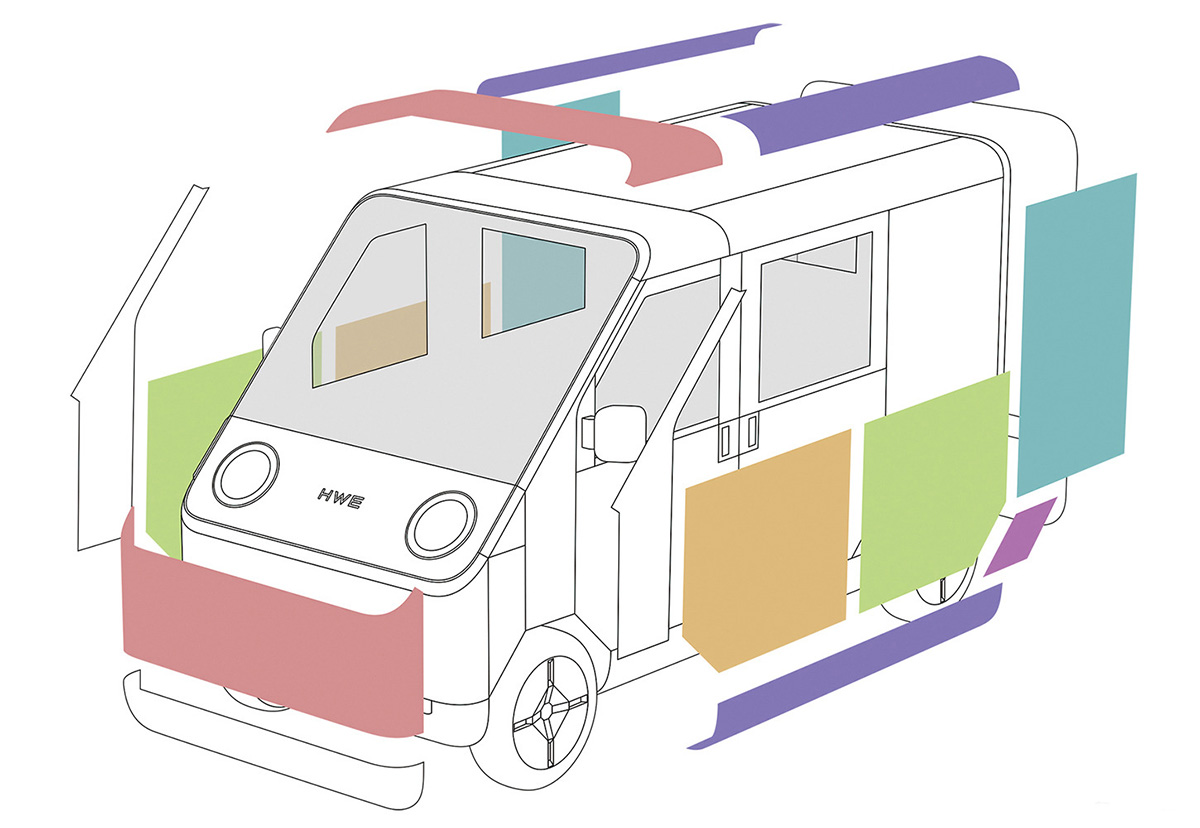 PUZZLE設計一切以運輸工具所需的便利性為依歸,盡可能地騰出所有空間以利載物,充分利空間將行李箱規劃為長方體,並可利用活動隔板靈活地安排內部空間,更特別的是前保險桿、車頂前端、左前門和左後門等多個部件都是由聽塊鈑件裁切製成,並透過各個零件中使用相容的通用零件,可降低製造過程中的浪費與提高生產率。