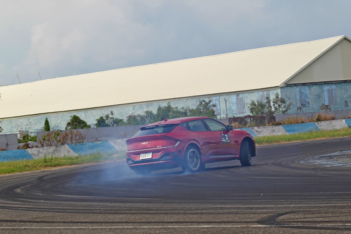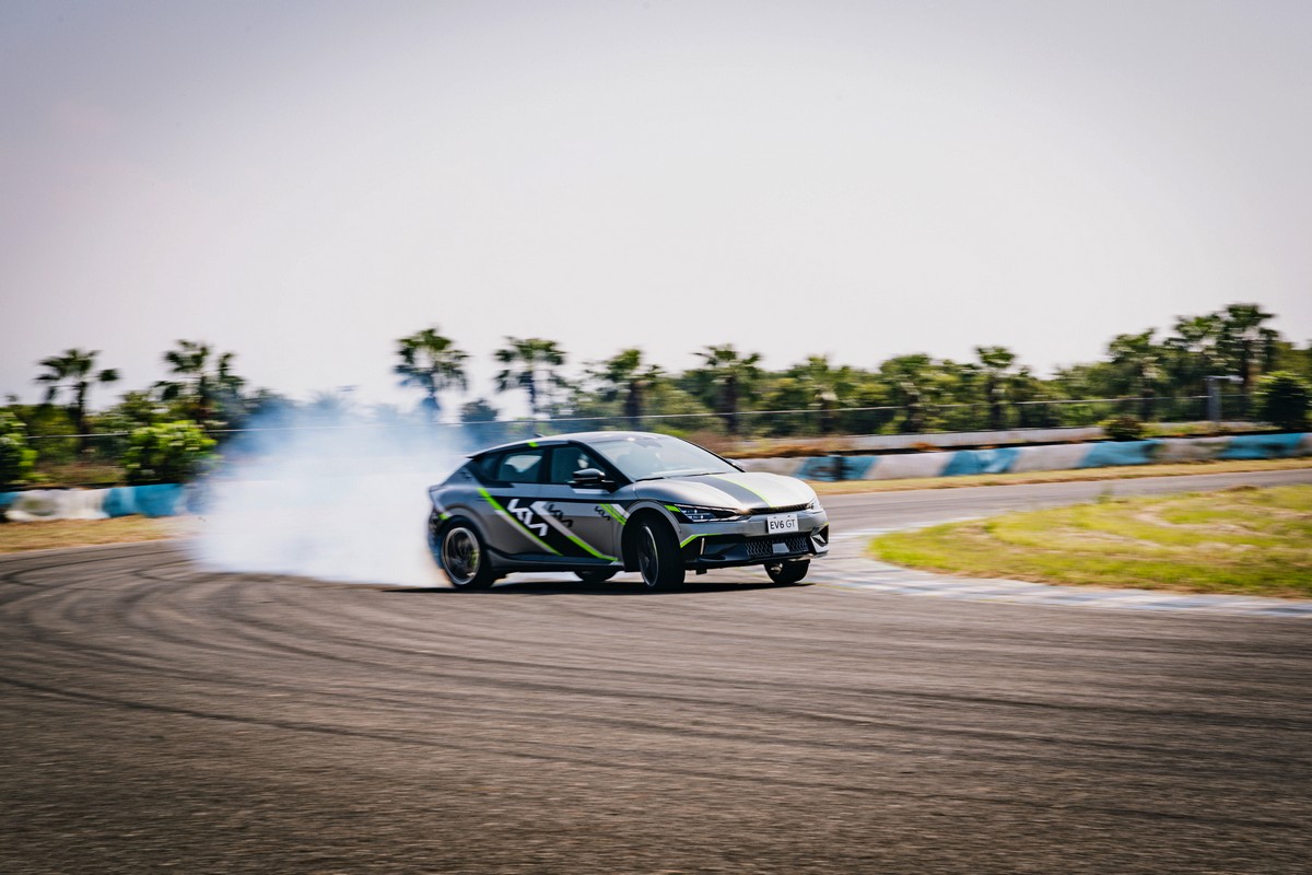 EV6 GT除了加速強勁與優異操控外還具備漂移模式,在完成啟動步驟後,EV6 GT就會切換成純後驅狀態,對此教練就載著媒體依序體驗,在強大動力驅動下很輕鬆就能做出漂移動作,於彎道上捲起白煙劃過美麗的弧線,而且數趟下來車輛狀態沒有任何衰退依舊穩定。