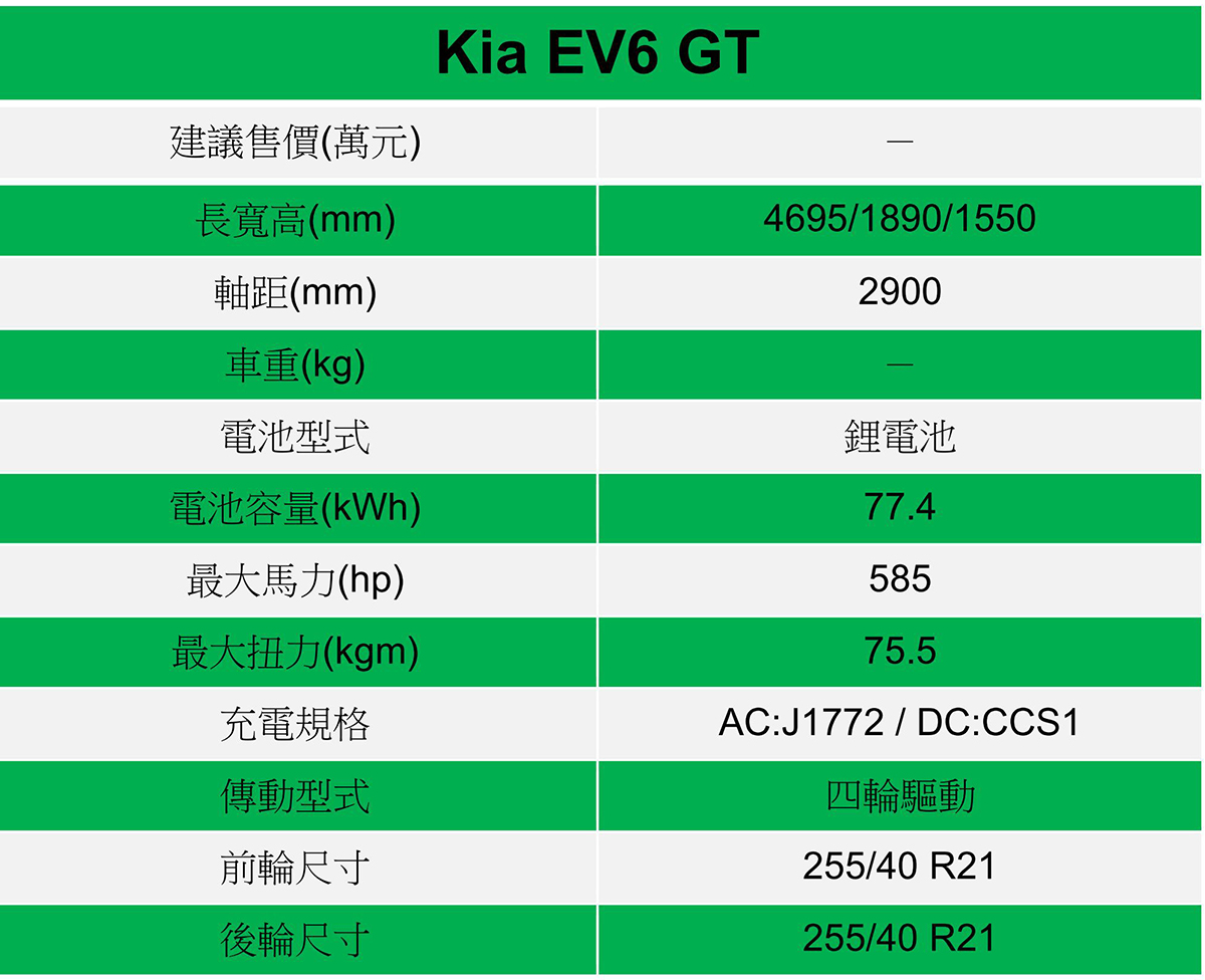 跑車型電子懸吊和e-LSD電子限滑差速器加上偏後驅個性,EV6 GT在賽道有著相當有趣的表現。 EV6 GT動力雖大但並不至於會帶來令人噁心的加速感受,跑車化電子懸吊於賽道上也沒有過於硬派的設定,而敏感的車尾和偏後驅帶滑的入彎個性,更是帶來充滿樂趣讓人欲罷不能的動態表現,除此之外完善的配備與主被動安全和續航表現也適合用於日常代步。而EV6 GT雖然承接Stinger性能地位,但這只是燃油交棒給電動而已,對於Kia來說EV6 GT只是性能電動化開端,因為未來新世代電動車都會有GT車型。