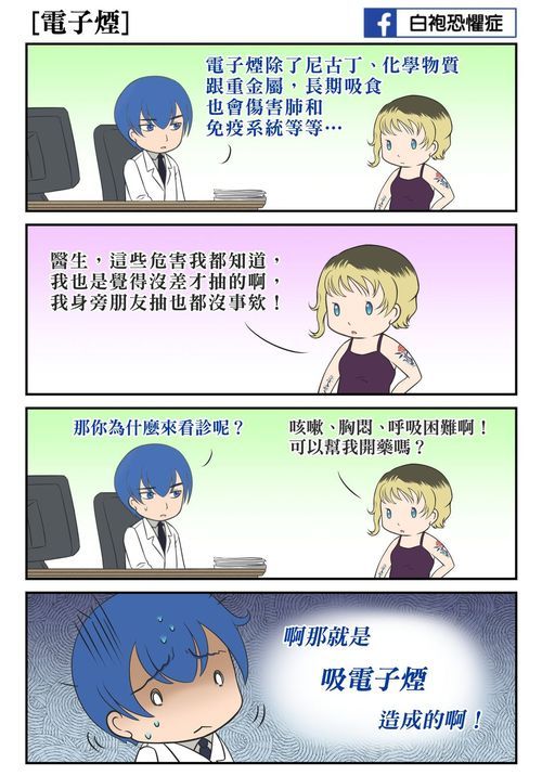具醫師背景的網路漫畫家「白袍恐懼症」作者小雨醫師,以有趣的漫畫圖文描述醫師跟病患診間對話,透過青少年最常接觸的網路社交媒體,提醒青少年遠離菸害!