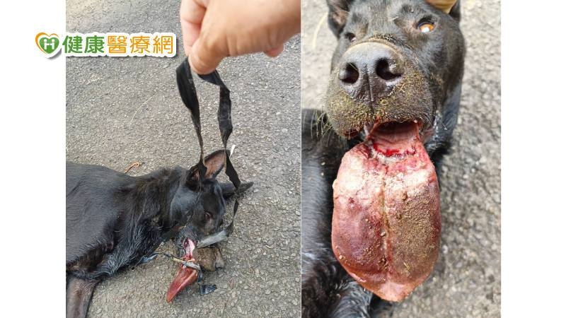 ▲「黑妞」疑似遭人以電火布纏繞舌頭,導致舌頭腫脹大如牛舌甚至組織壞死!(新北市動保處提供)