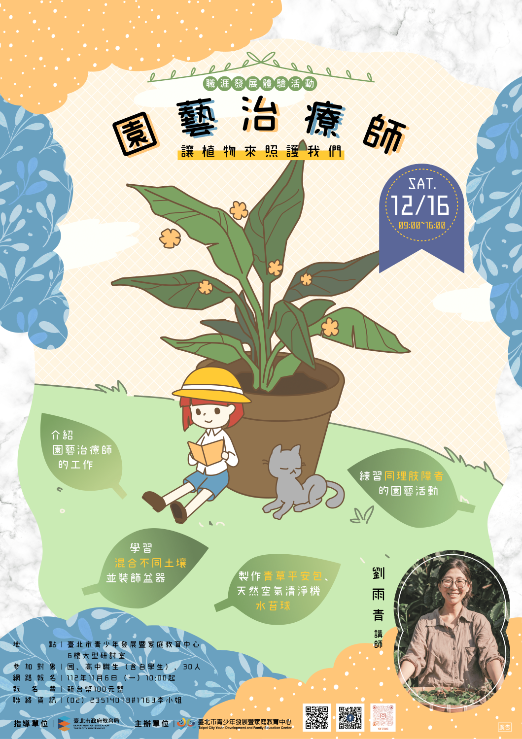 「園藝治療」在台灣是新興且快速成長的領域,與一般園藝活動不同,過程中「人」才是主角。「園藝治療師」也在過程中扮演重要的角色,青發家教中心特別邀請台灣與亞太園藝輔助治療協會註冊園藝治療師劉雨青,於12月16日舉辦一日「園藝治療師」職涯發展體驗活動,透過園藝治療師的講述及實際實作體驗,引領學員體驗植物如何療癒身心。青發家教中心表示,青少年容易遇到學校課業、同儕社交、家庭成員以及個人情感等生活壓力,透過練習與植物和大自然互動,可協助青少年學習如何拉近人與人的距離;而將植物帶進人們的生命中,更可以幫助人們練習放鬆,釋放內心的壓力和煩惱、提升學習專注力及促進社交技能。