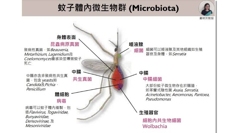 嚴明芳教授說明,一項研究探討蚊子腸道微生物(Gut Microbiota)是否影響流行傳播,發現蚊子腸道微生物群可直接影響其傳播能力,方法如:分泌抑制病毒和瘧原蟲化學物質和酶、誘導免疫反應、改變蚊子中腸屏障或生化環境等。蚊子腸道微生物對蚊子具有其他作用,包括:調節繁殖行為和繁殖率,最終影響媒介密度,交配過程中產生吸引蚊子交配之費洛蒙,改變交配偏好,以及影響蚊子繁殖後代,過去研究發現,在淡色庫蚊(Culex pipiens)中,將芽孢桿菌和葡萄球菌重新引入經抗生素處理蚊子中可增強其繁殖能力。