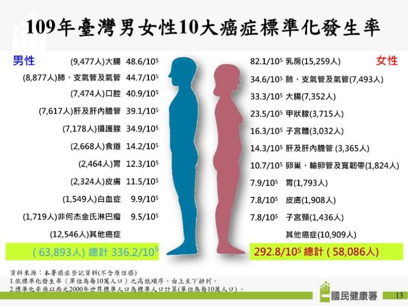 另外,若將各癌症的標準化發生率分別來看,110年大腸癌、肝癌、口腔癌、胃癌、甲狀腺癌、皮膚癌、子宮頸癌及食道癌發生率確實有下降,但是乳癌、肺癌、攝護腺癌及子宮體癌發生率則為上升。