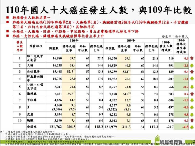 根據最新衛福部110年癌症登記報告顯示,110年新發生癌症人數為12萬1,762人,較109年減少217人,是近年來首度下降,而全癌症的標準化發生率為每10萬人口306.5人,也較109年下降4.8人。不過國健署表示,未來是否會持續下降,仍需長期觀察趨勢變化。另外,若將各癌症的標準化發生率分別來看,110年大腸癌、肝癌、口腔癌、胃癌、甲狀腺癌、皮膚癌、子宮頸癌及食道癌發生率確實有下降,但是乳癌、肺癌、攝護腺癌及子宮體癌發生率則為上升。