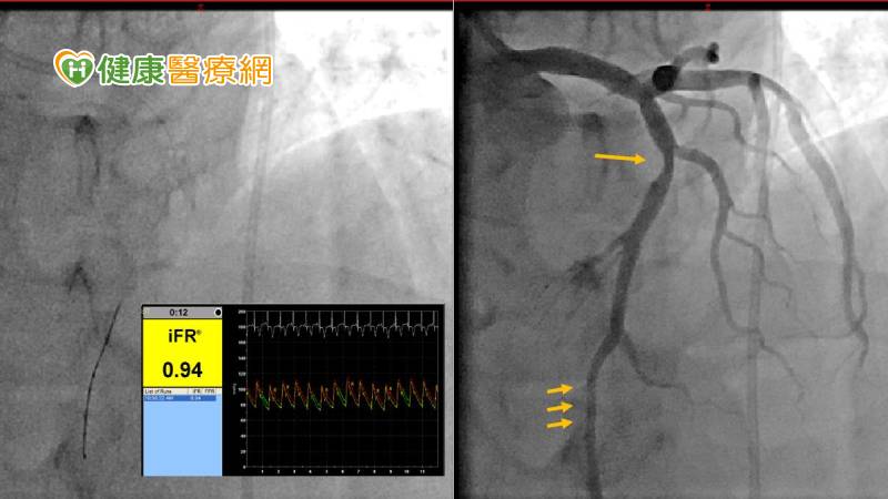 60歲的江太太患有糖尿病、高血壓、高血脂、十二指腸潰瘍,曾經因嚴重腸胃道出血而病危住院多日,今年更發現冠狀動脈中有廣泛的動脈硬化而且懷疑有嚴重狹窄!患者住院接受心導管的檢查,顯示冠狀動脈左前降支的中段及遠端都有約50-70%狹窄病灶,可能需要做血管擴張並置放冠狀動脈支架。但放了支架後,需要長時間同時服用2種抗血小板的藥物以避免支架內急性血栓,江太太擔心胃出血復發,而且平日沒有明顯心絞痛,希望好好地再度謹慎評估。心血管中心團隊使用即時冠狀動脈流速差iFR測量系統,以導絲進入血管量測左前降支在狹窄處前後的壓力差,數值顯示沒有明顯差異,暫時不需要置放支架。江太太在心導管檢查後,繼續積極服藥控制慢性病,經過多年仍沒有心絞痛,追蹤心臟的功能也在正常範圍。