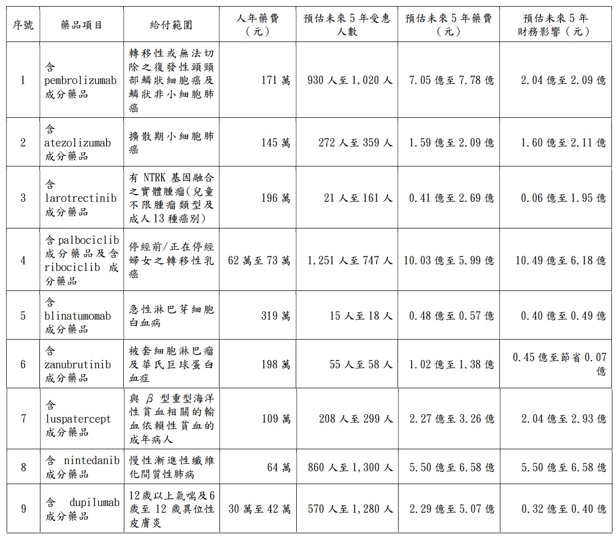 (5)含blinatumomab成分藥品用於治療急性淋巴芽細胞白血病,以及新收載治療被套細胞淋巴瘤及華氏巨球蛋白血症之含zanubrutinib成分新藥,預估約2,090名病人受惠,挹注藥費約20.5億元,財務影響約12.75億元。