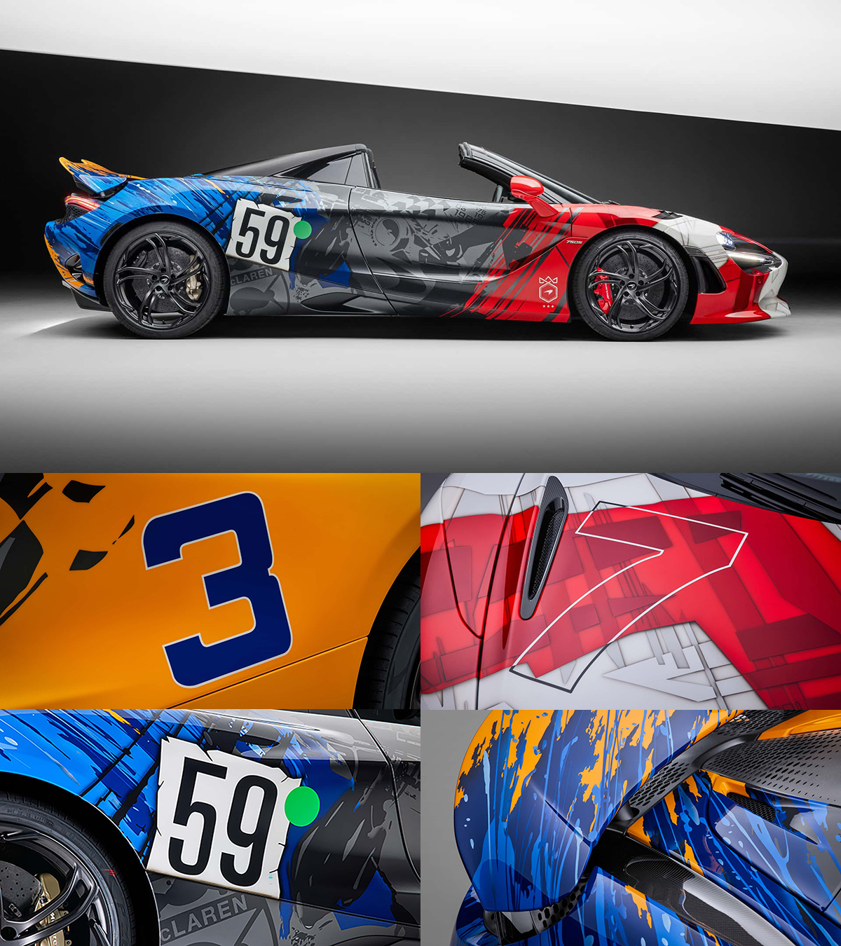 2023年適逢McLaren成立60周年,為紀念在F1摩納哥大獎賽、Indy500大賽與LeMans大賽之世界三大賽事中皆獲得過冠軍,客製化部門MSO便以750 S打造了集三大賽事冠軍車外觀元素的彩繪紀念車「3-7-59」。