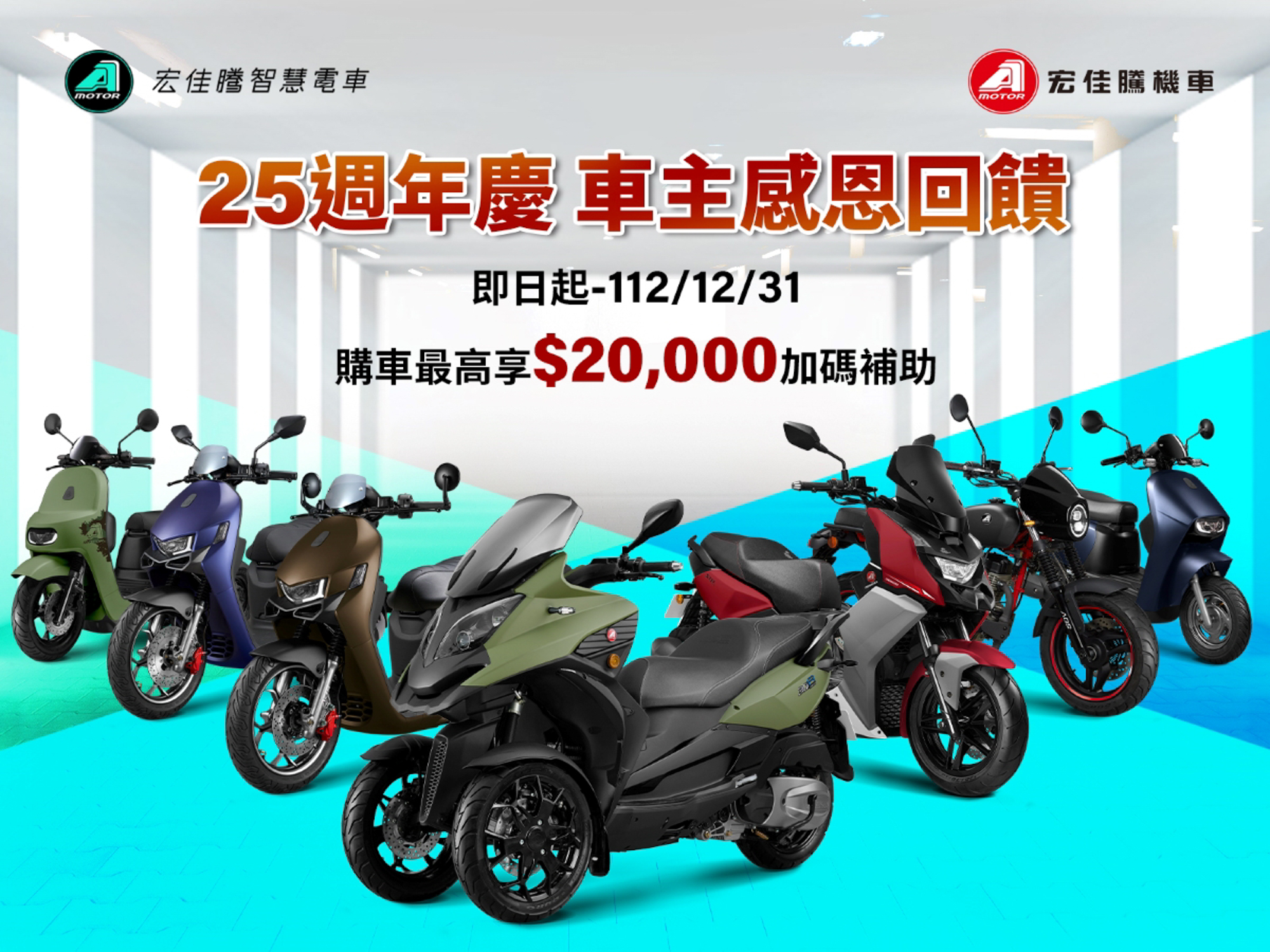 - 即日起至12月31日止,凡持不限年份宏佳騰智慧電車車款之車主行車執照,以及出廠日為民國109年12月31日前(含)之宏佳騰燃油機車車款之車主行車執照,至宏佳騰經銷據點購買以下車款即享老車主回饋方案
