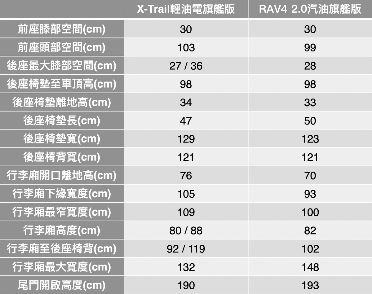RAV4在後座椅墊的深度稍微更好,前座膝部空間、後座椅墊至車頂及後座椅背寬與X-TRAIL輕油電表現相似,其他多數部分則略遜於X-TRAIL輕油電。