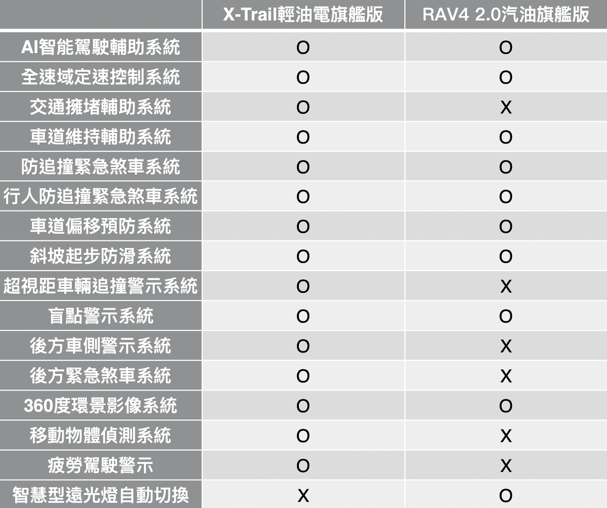 一般科技配備方面X-TRAIL輕油電略勝一疇,而在行路靜謐性與聽覺表現部分更是X-TRAIL輕油電的強項所在。 X-TRAIL vs. RAV4 科技配備比較表