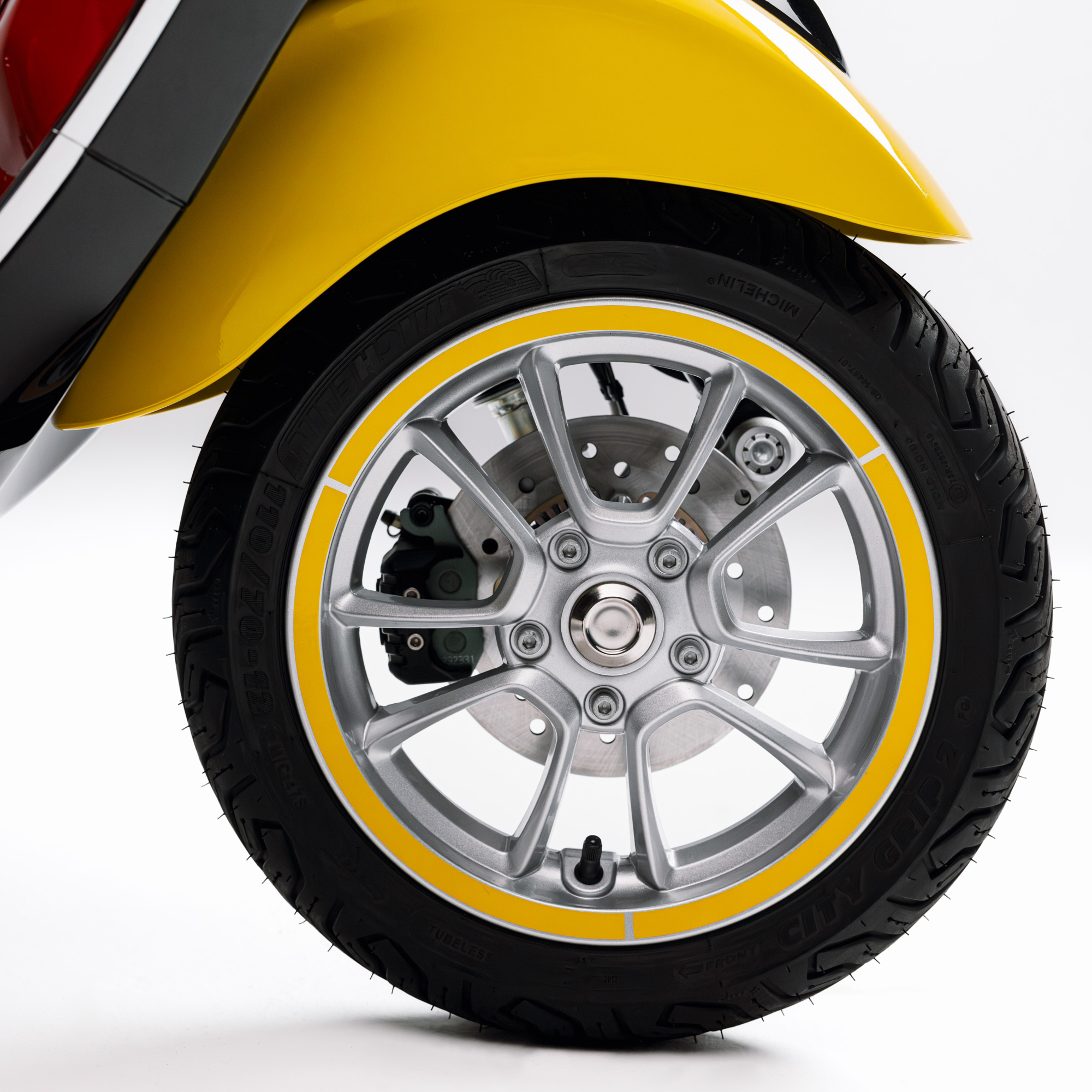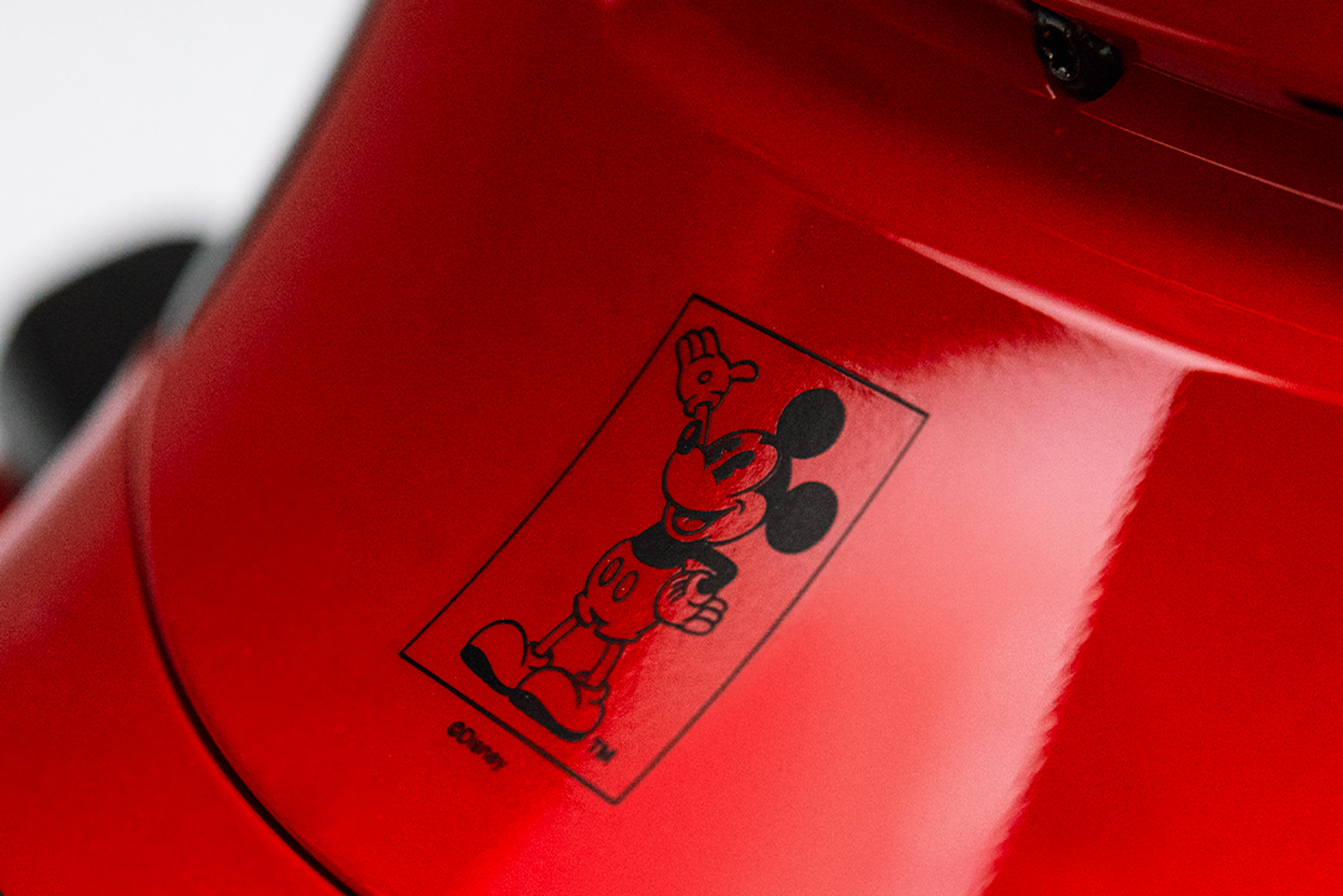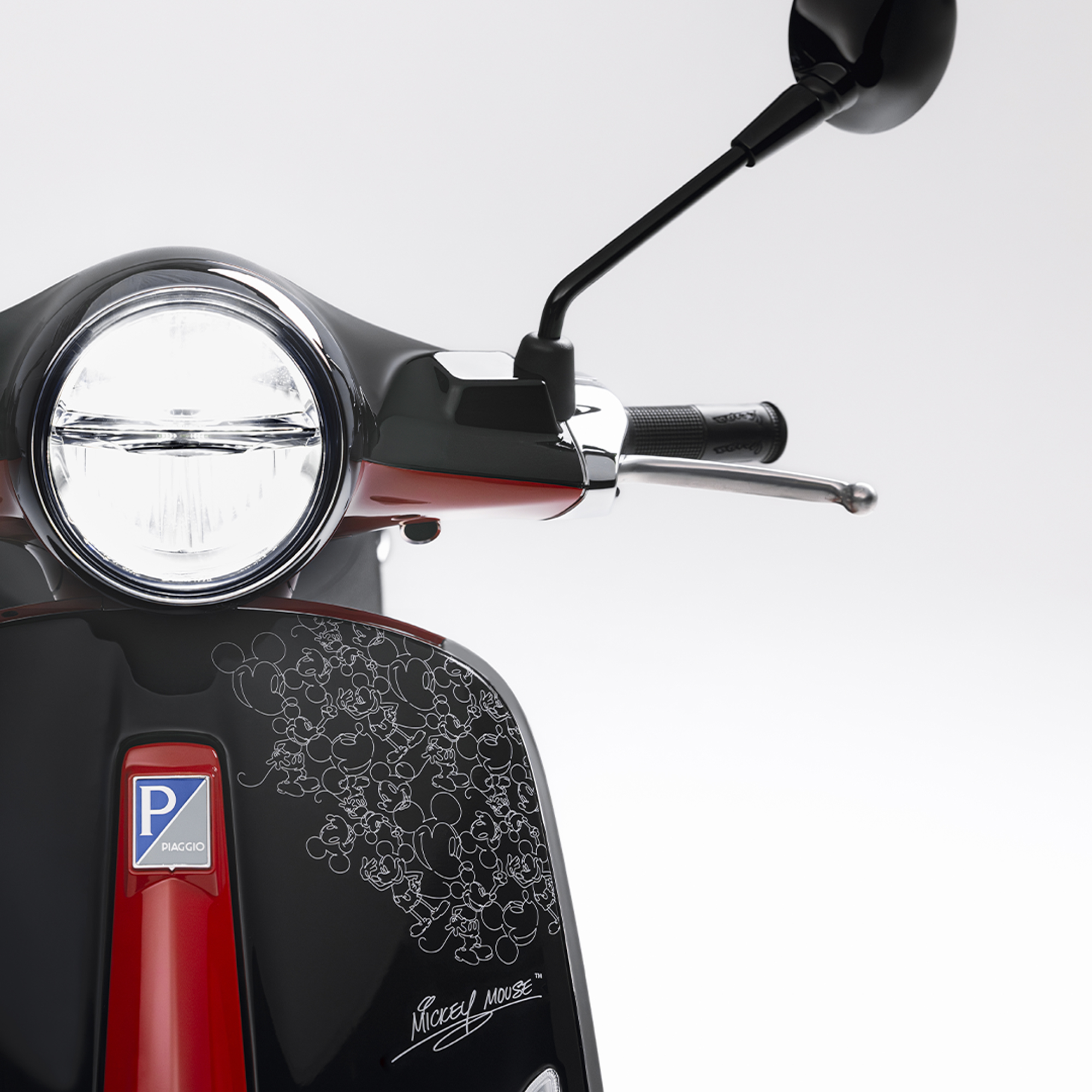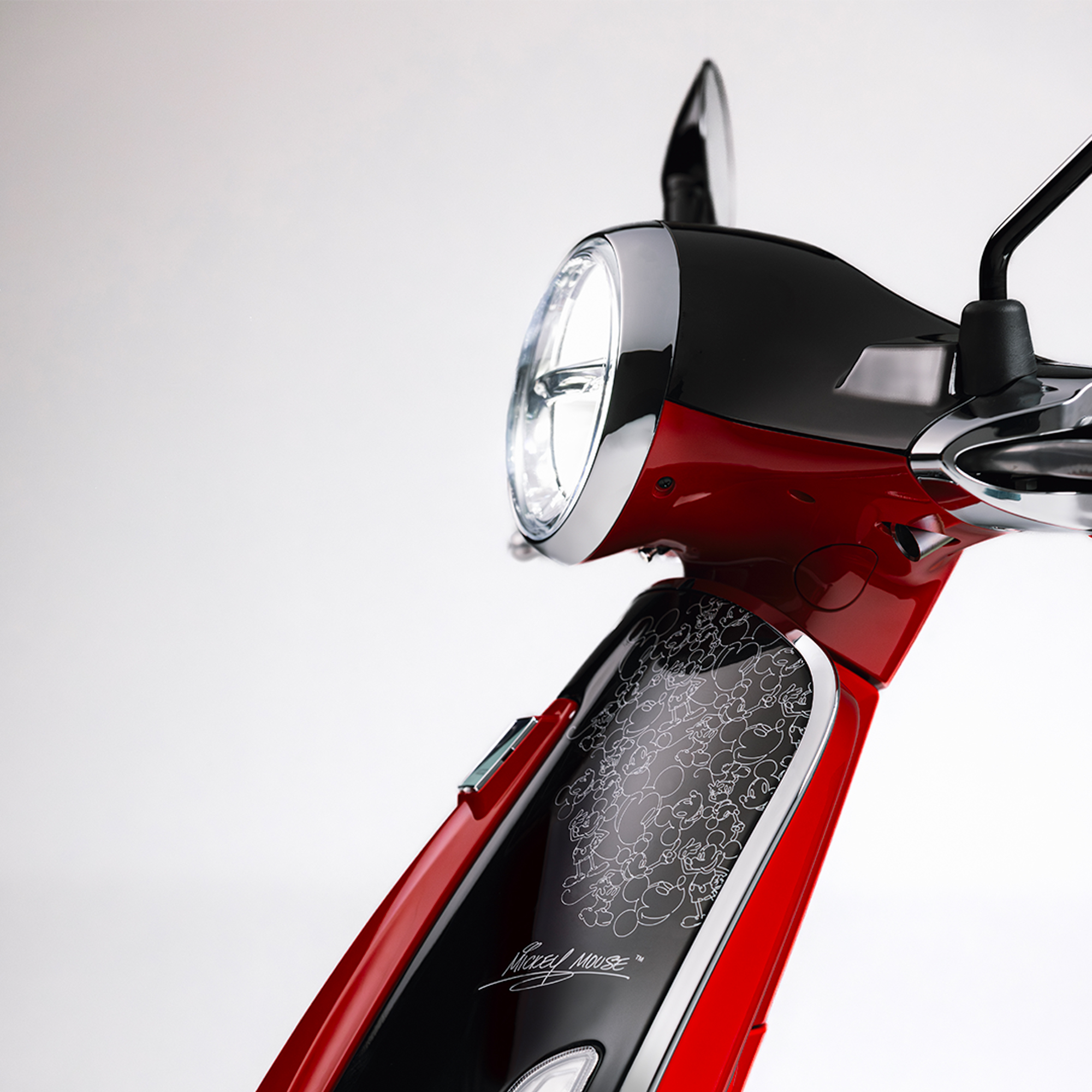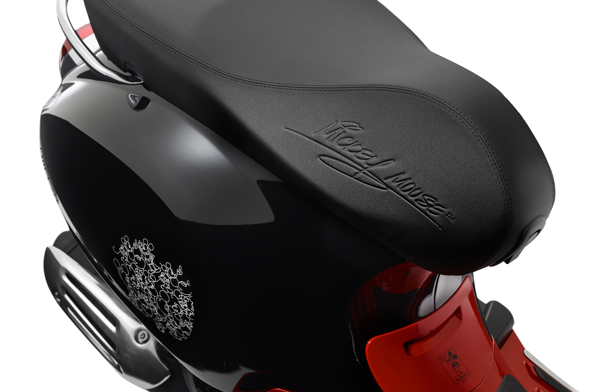 迪士尼米老鼠特仕版Vespa以米老鼠經典配色:黑色、紅色、黃色及白色活潑地呈現,包含代表米老鼠身體的黑色車身;車身內側、腳踏板處和喇叭領結飾蓋,則選用了富有活力的紅色,與米老鼠的經典褲裝造型相得益彰;黃色前土除和前後輪圈樣式,巧妙勾勒出米老鼠的鞋款;黑色正圓造型的後視鏡則完美呼應了米老鼠顯著的圓形耳朵;最後,白色的米老鼠手繪設計插圖精緻地呈現於車身兩側和車前飾版,賦予整體設計更多趣味細節。除此之外,設計亮點還包括了別具象徵性的米老鼠"Mickey Mouse"簽名,精緻地壓印在黑色座墊上並點綴於車前面板,呈現出與眾不同的設計巧思。最後,於車身內側下方,還可以發現專屬的迪士尼認證標誌,彰顯此限量特仕版的獨一無二。