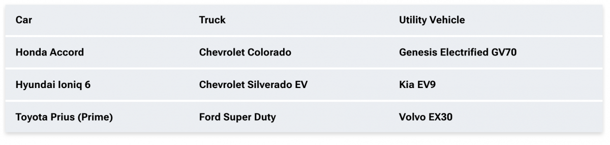 年度風雲車是大家討論的焦點之一,而每年初就是北美年度風雲車NACOTY公布獲勝者的日子,今年總共有52輛符合資格的車款,在9月份的時候已經篩選出25輛車進入第二階段,而現在公佈了最終決賽的九輛車,其中有五輛是純電車款,在休旅車級別當中更是三輛全都是電動車,分別是Genesis Electrified GV70、Kia EV9以及Volvo EX30,而在一般車型當中除了一輛電動車Hyundai Ioniq 6之外,其他兩輛Honda Accord以及Toyota Prius/Prius Prime也都帶有油電化的特色,基本上整個級別也都是電動化的車型。