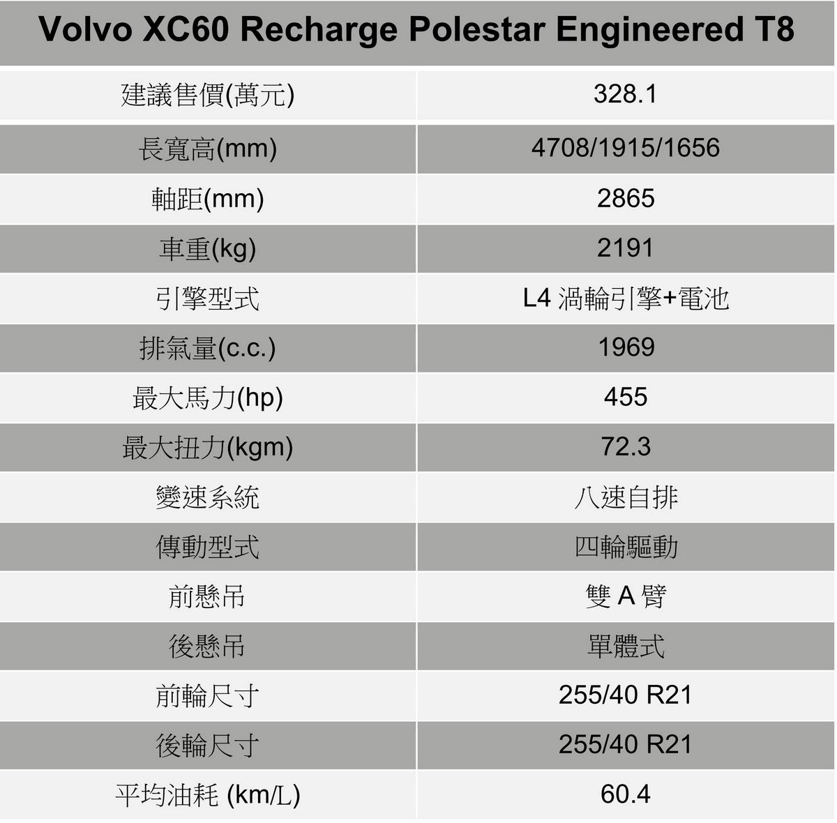 XC60 Recharge Polestar Engineered T8 Polestar因有配置Ohlins懸吊而讓人非常期待動態表現。 除配備清單上ACC主動車距控制巡航、PAII智能駕駛輔助、倒車車側警示主動煞車、對向來車閃避輔助主動煞車、行人偵測完全主動煞車…等滿滿的安全系統與Google車載資訊娛樂系統外,XC60 Recharge Polestar Engineered T8所搭載的2.0升渦輪引擎,就已提供310hp最大馬力與40.8kgm峰值扭力,除此之外因PHEV系統緣故,配置的18.8kWh電池不僅能提供86公里純電行駛里程,亦額外給予145hp/31.5kgm動力,如此一來讓XC60 Recharge Polestar Engineered T8有著455hp/72.3kgm最大輸出,而在此性能推動下只要4.9秒就能加速至100km/h。