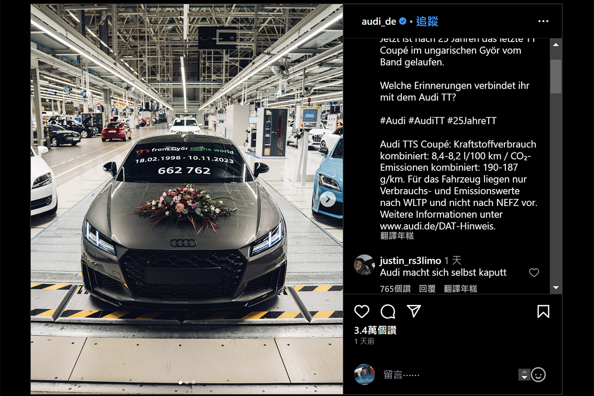 Audi TT要退出市場傳言已久,但這天終於來世來了,Audi昨日在官方IG發布了最後一輛TT下線的訊息訊息,自1995年初代TT以概念車身分亮相,1998年上市至今演進了三個世代,到2023年11月10日正式畫下休止符。