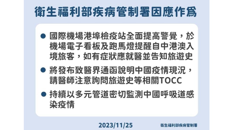為因應近期中國呼吸道疾病發生率上升,疾管署持續加強國內外疫情監測,加強機場港埠全面戒備,機場的電子看板跟跑馬燈都已設置告示,提醒自中港澳入境旅客注意自身症狀。同時發布醫界通函,提醒全國醫界留意中國疫情,看診時應落實「TOCC」機制,確實詢問並記錄旅遊史(Travel history)、職業別(Occupation)、接觸史(Contact history)及是否群聚(Cluster)等資訊,依循通報病例處理流程進行採檢及通報。