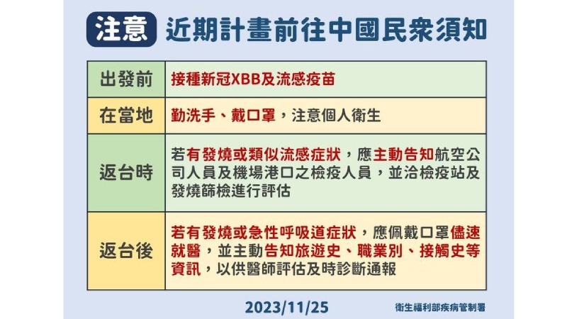 疾管署並提醒近期欲前往中國之民眾留意: