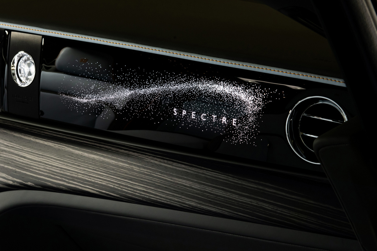 而這一次 Spectre 的星光飾板(Illuminated Fascia)延續著空靈的夜空主題。星光飾板由勞斯萊斯在過去兩年多的時間裡,歷經超過10,000個工時研發而成。在星光飾板上,超過5,500顆星星圍繞著Spectre字標熠熠生輝。