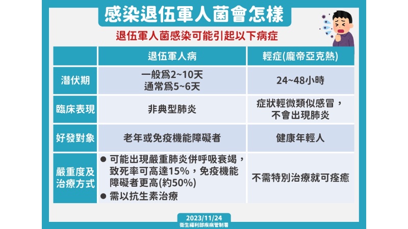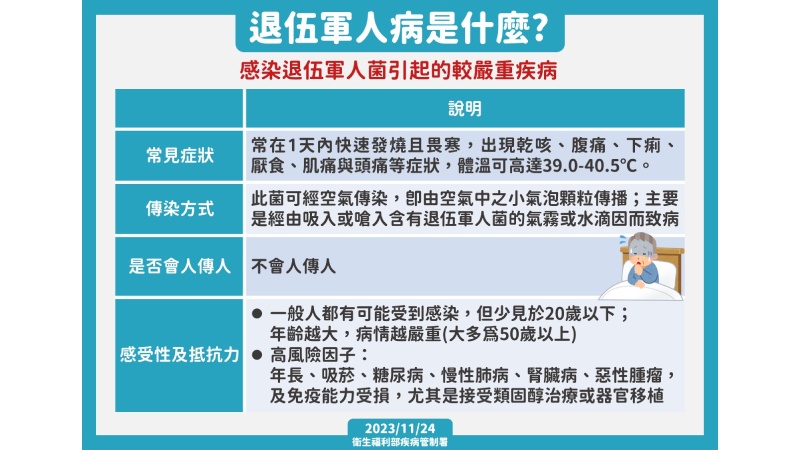 三軍總醫院特聘醫師張峰義指出,退伍軍人病為感染退伍軍人菌引起的較嚴重疾病,退伍軍人菌普遍存在於天然及人工水體環境中,主要是經由吸入或嗆入含有退伍軍人菌的氣霧或水滴因而致病,不會以人傳人方式傳播,但致病性與人體免疫狀況相關,高風險族群包括年長、吸菸、慢性病(如糖尿病、慢性肺病、腎臟病、惡性腫瘤等)、免疫低下者。新生兒感染較為少見,據國際相關文獻,新生兒感染退伍軍人菌的途徑主要是暴露於會產生蒸霧或氣霧之治療或設施、經水中生產、嗆入或吸入污染的水等途徑感染,若發生肺炎其臨床表現與其它病原菌引發的症狀相近,鑑別診斷難度較高,呼籲臨床醫師提高警覺,如遇新生兒肺炎個案時,應評估暴露風險,將退伍軍人病納入鑑別診斷,以利早期診斷治療。