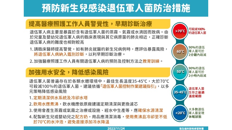 對於預防新生兒染病,醫師提醒配製新生兒或嬰幼兒的配方奶時,用品應清潔消毒,且泡奶粉不可低於70度才能殺滅退伍軍人菌,並應避免途中添加冷水,應煮沸後置放至適合溫度再沖泡奶粉。