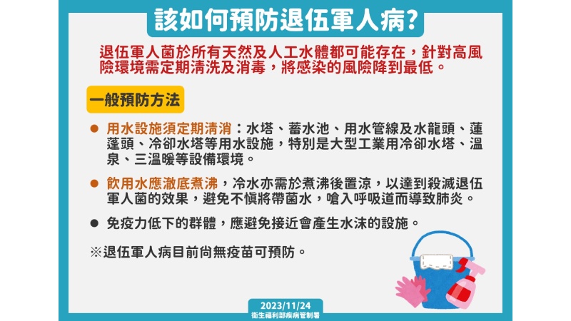 張峰義提醒,退伍軍人病目前尚無疫苗可預防,為確保用水安全,針對高風險環境定期清洗及消毒,可將感染退伍軍人菌的風險降到最低。營業場所應定期清潔消毒水塔、蓄水池、用水管線及水龍頭、蓮蓬頭、冷卻水塔、飲水機等用水設施,特別是大型工業用冷卻水塔、溫泉、三溫暖等設備環境,建議於定期清消後進行退伍軍人菌檢測。為預防因不慎將帶菌水吸入或嗆入呼吸道導致肺炎,免疫力低下族群應避免接近會產生水霧的設施。此外飲用水應澈底煮沸,冷水亦需於煮沸後置涼。