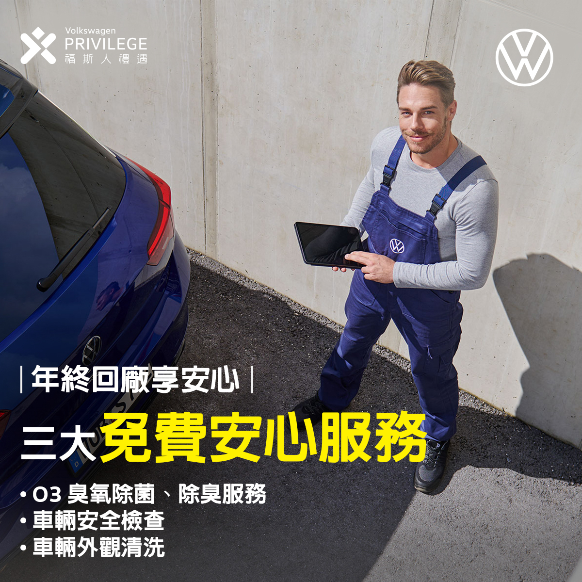 台灣福斯汽車總裁Steffen Knapp表示:「台灣福斯汽車自始至終,矢志成為車主最佳後盾,與車主們一同走過歲末年初,隨時守護行車安全,確保舒適的冬日出遊體驗。」自12月1日起至明年1月31日止,展開為期兩個月的年終健檢,給予車主三大免費貼心服務,包括O3臭氧除菌、除臭服務、車輛外觀清潔服務與21項車輛安全檢查,不僅能讓愛車在寒冷冬季行進順暢無虞,更可放心在年末與好友家人相聚,共度溫暖旅行,享受歡聚時刻。