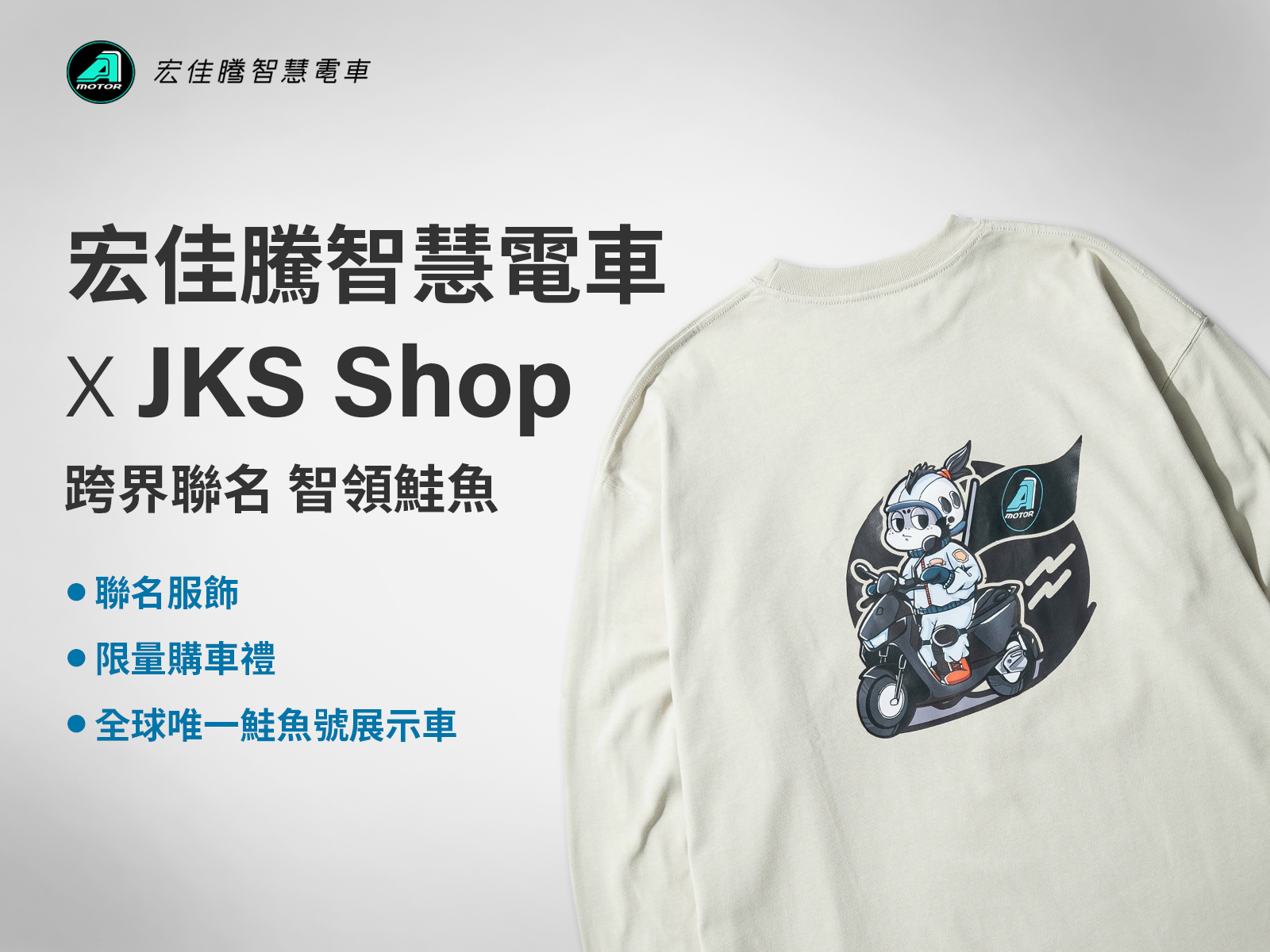 宏佳騰於8月和潮流品牌JKS SHOP合作打造最潮試車,引起年輕世代熱烈迴響後,再度攜手推出聯名商品。JKS SHOP與宏佳騰同為台灣在地深耕品牌,秉持相同的創新理念,持續帶給消費者更優質的產品選擇,本次合作的聯名品牌-AGILITY為JKS SHOP自有品牌,以櫻花鉤吻鮭為主視覺,傳遞獨創以及鮭魚逆流而上堅持不懈的精神,聯名新品包含長Tee、刺繡LOGO腰包,新品圖騰以宏佳騰元素結合鮭魚丸帶給消費者全新騎勁感,聯名商品將在12月9日中午12點於JKS SHOP官網及線下門市開始販售(數量有限,售完為止),另外,即日起至全台宏佳騰智慧門市購買任一款智慧電車,即送宏佳騰x JKS Shop獨家聯名帆布提袋,各門市數量有限,送完為止。