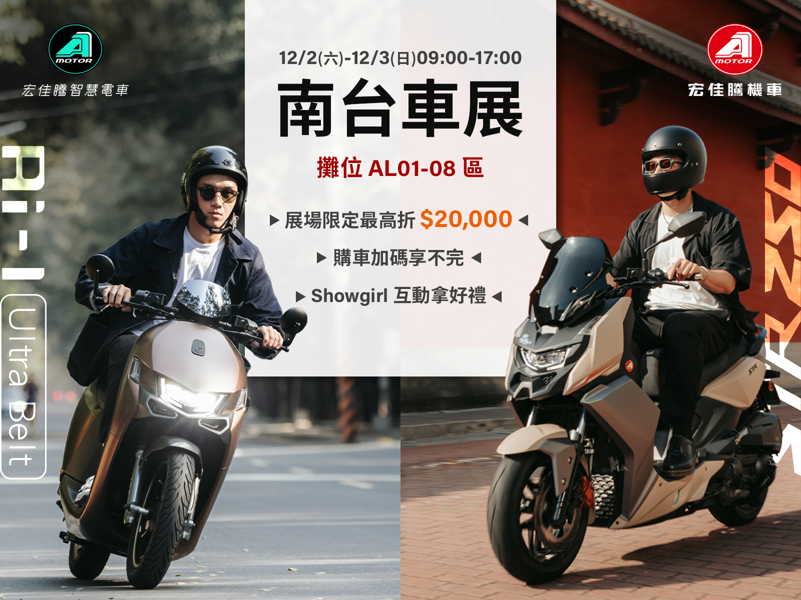 一年一度的車壇盛事「南台汽機車大展」將於12月2日至12月3日在南台科技大學校園(台南市永康區南台街1號)盛大舉行, 宏佳騰今年持續積極參與,除展示一系列油、電熱銷車款外,現場也提供專屬購車優惠,燃油機車享最高加碼$10,000元折扣、智慧電車全系列加贈延長保固一年,還可疊加25週年年終促銷方案,再加碼玩幸運轉盤轉好禮,豐富禮品包含品牌飛利浦電競2系列刮鬍刀、個性衝鋒衣、質感奶茶色安全帽、品牌風雨衣+防水背包等,數量有限,送完即止;同時,宏佳騰攤位更是亮點滿滿,歡迎車友蒞臨與主持人及Showgirl熱情互動,每小時都有驚喜好禮等您拿,填寫問卷更可獲得宏佳騰獨家的「品牌環保收納袋」。誠摯邀請民眾一同參與宏佳騰特別為本次南台車展準備的豐富活動。