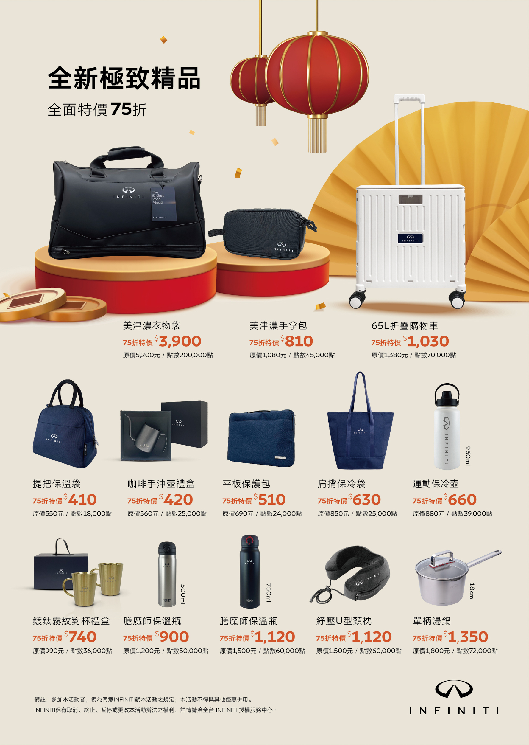 INFINITI 2024新春健檢活動期間,INFINITI提供全新極致精品特價75折優惠,包含美津濃聯名衣物袋特價3,900元/原價5,200元、美津濃聯名手拿包特價810元/原價1,080元(註2),其他還有平板保護包、65L折疊購物車以及紓壓U型頸枕等全新極致精品75折優惠(註3),讓車主享受優質服務同時擁有各項超值優惠。