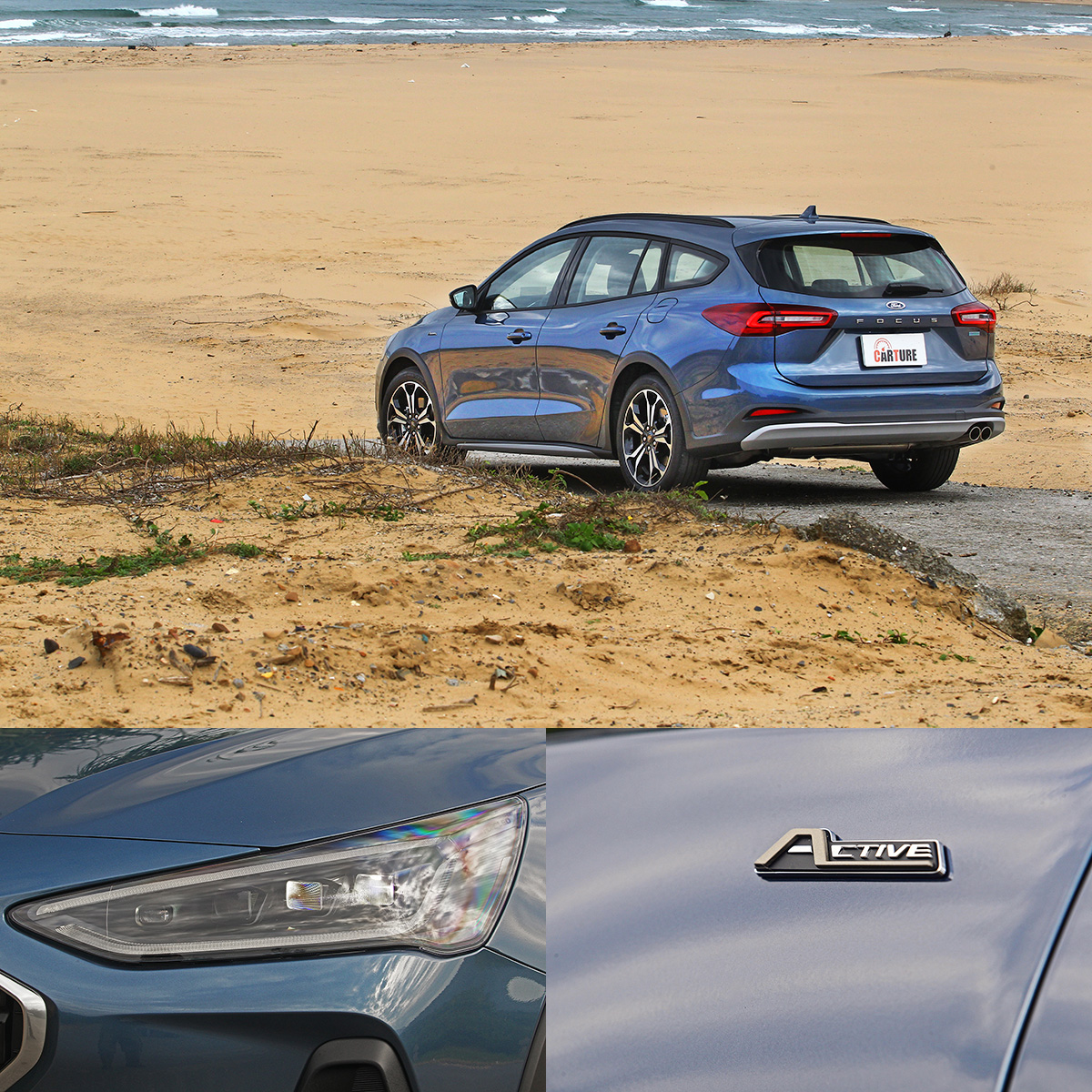 在外觀部分,除了較Focus Wagon略為增高的車高,也導入了Focus Ative的專屬抗磨套件,水箱護罩樣式也改為鉻直列式,車頭與車尾也配上了類金屬護板,以及車側側裙,車頂則有鋁合金車頂架〈靜態載重215kg/動態載重75kg〉,再配上LED燻黑設計尾燈,胎圈部分街配置18吋五輻雙色切削鋁圈,不過X車型與Vignale車型的樣式有所不同,此外,試駕的Vignale車型升級增配了FORD MATRIX LED矩陣式智能動態照明系統。