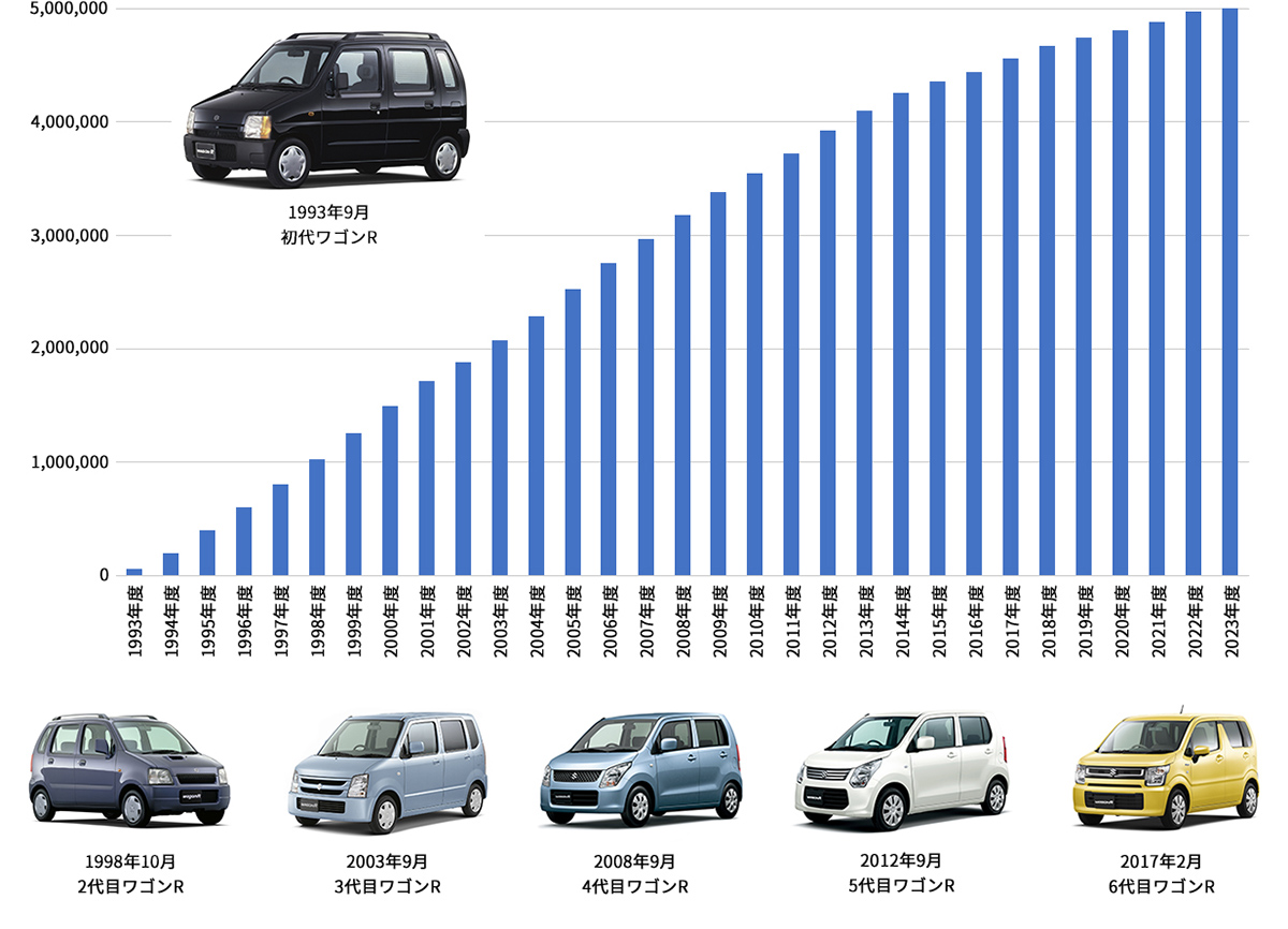Wagon R可說是Suzuki最具代表性、也是台灣車迷最熟悉的日本K Car之一,自1993年9月問世以來,至2023年不僅屆滿30年,截至11月2日,Wagon R車系在日本累計銷量正式突破500萬輛,成為繼Alto之後第二款Suzuki在日本國內累計銷量突破500萬輛的車型。