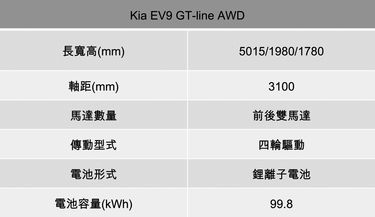 懸吊反應沈穩且質感良好,但彎中依舊保有優異循積性,同時行進噪音幾乎全被阻絕在外,帶來極為優異的行路品質。 既然生為純電動力車款,充電效能與便利性當然也該是評判時的最重點,Kia EV9全車系採取800V充電架構,國內引進的將會是99.8kWh的Long Range版本,而透過CCS1規格充電樁理想狀態下僅需24分鐘便能由10%充至80%,由於目前國內尚未送測因而尚未公布續航成績,但按原廠數據推估理應具備500km左右的滿電行駛距離,對應台灣日常使用情境已綽綽有餘。