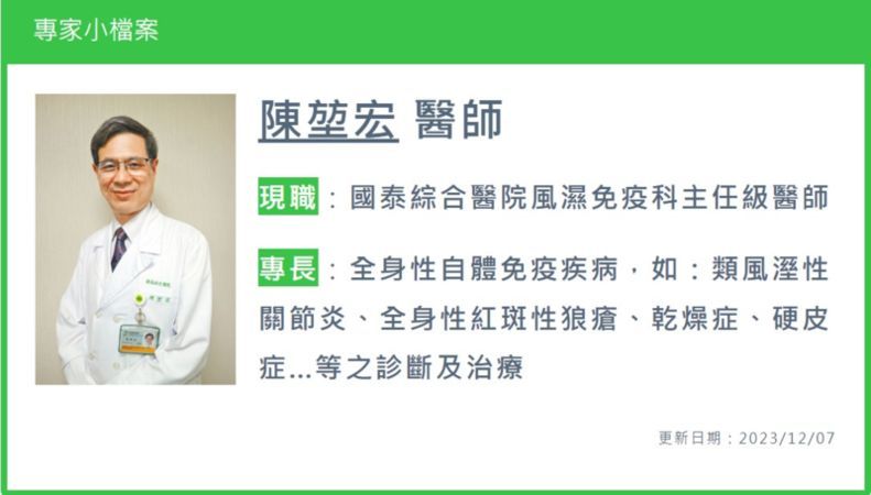 陳堃宏醫師也提醒,肺纖維化一旦造成損傷便不可逆,現階段主要的治療目標在於穩住病情、維持生活品質,再次呼籲自體免疫疾病合併肺纖維化病友千萬不可以自行停藥,並且定期回診並配合風濕免疫科醫師的治療,利用類固醇、免疫調節劑、生物製劑等藥物抑制全身性發炎反應以外,也建議多專科聯合照護,與胸腔內科醫師積極配合,搭配抗肺纖維化的藥物,雙管齊下,才能更有效的控制免疫疾病與肺纖維化,維持良好生活品質。