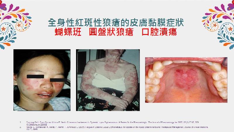 林口長庚紀念醫院風濕過敏免疫科醫師羅淑芬指出,俗稱蝴蝶斑的紅疹是最典型症狀,高達8成患者易於臉、頸、手臂等處出現紅斑,許多患者更是長期處於疲勞狀態,由於自體免疫系統可能攻擊不同器官,因此也易伴隨骨骼關節病變、血液系統異常、腎臟及心血管疾病等諸多共病,根據統計,超過50%的病患在診斷後10年內會產生不可逆的器官損傷,死亡率更是一般人的2.6倍,其中又以感染症、心血管疾病及惡性腫瘤為前三大死因。另外,因狼瘡腎炎引發的急性腎衰竭以及長期使用高劑量類固醇,亦是死亡的高風險因子。