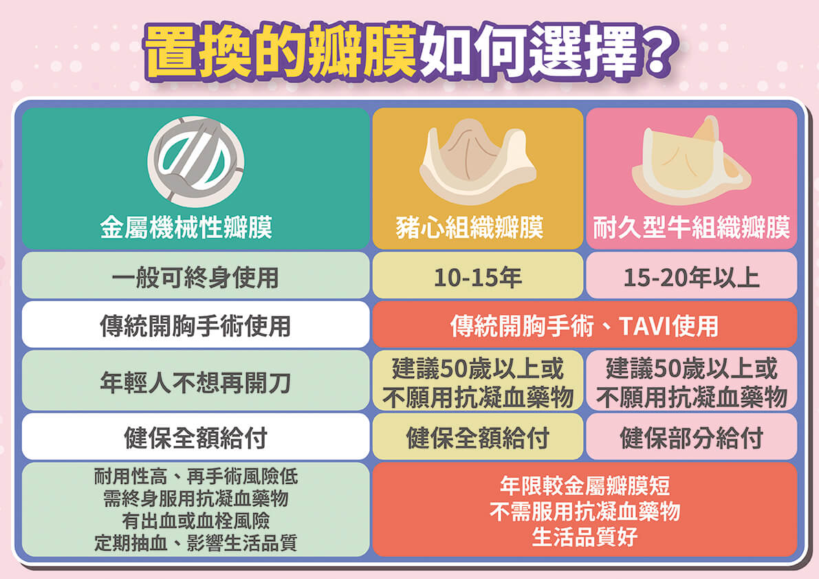 選擇TAVI手術,原則上只有生物瓣膜能使用;而選擇開胸手術,則有金屬瓣膜及生物瓣膜能挑選。金屬瓣膜耐用期限長,大多可終身使用,缺點是需終身服用抗凝血劑來預防血栓;生物瓣膜則是有豬和牛兩種選擇,優點是抗凝血劑僅需服用三個月即可停用,不過長期使用可能會慢慢退化,因此在10到20年間,有機會需再次進行手術。